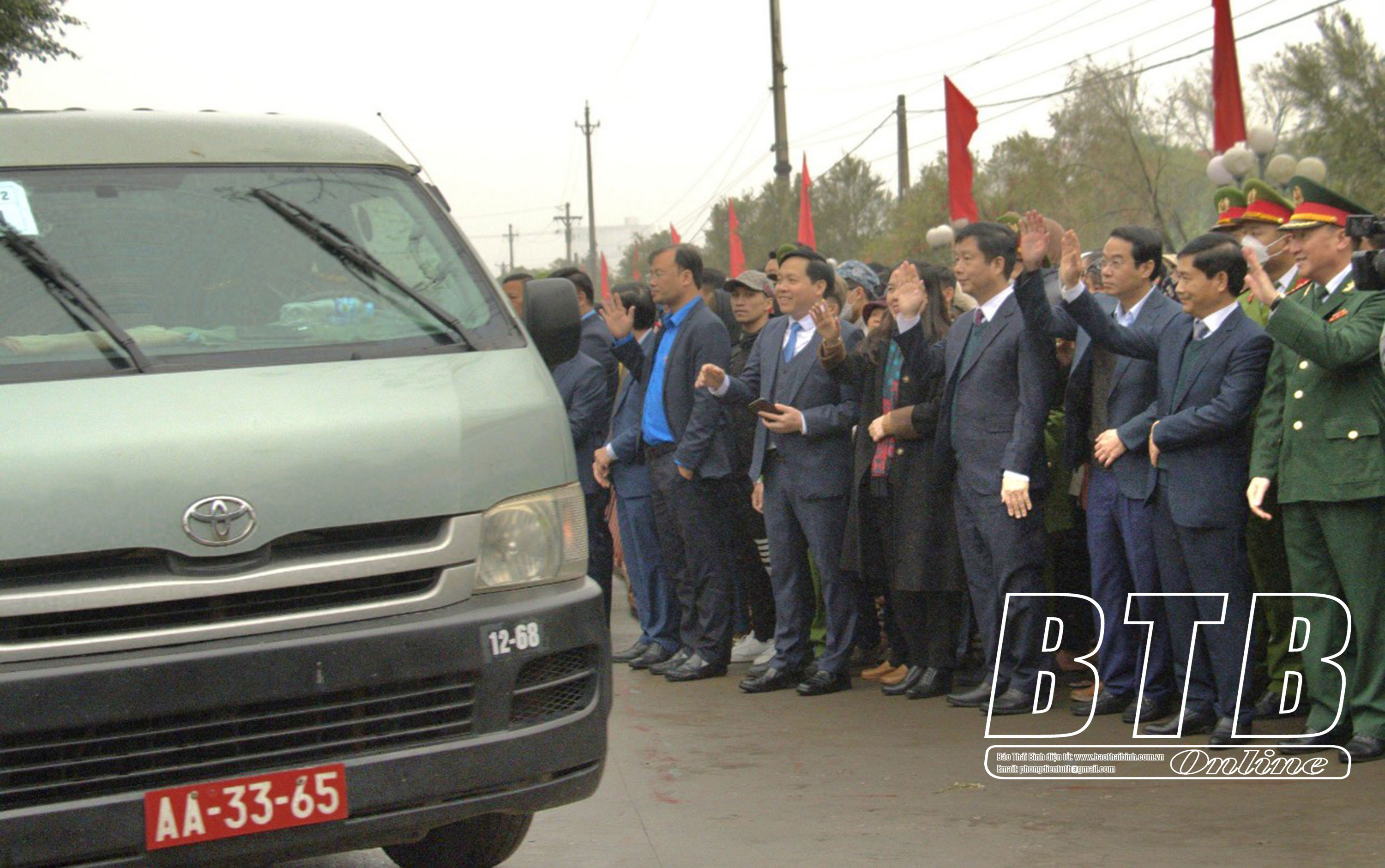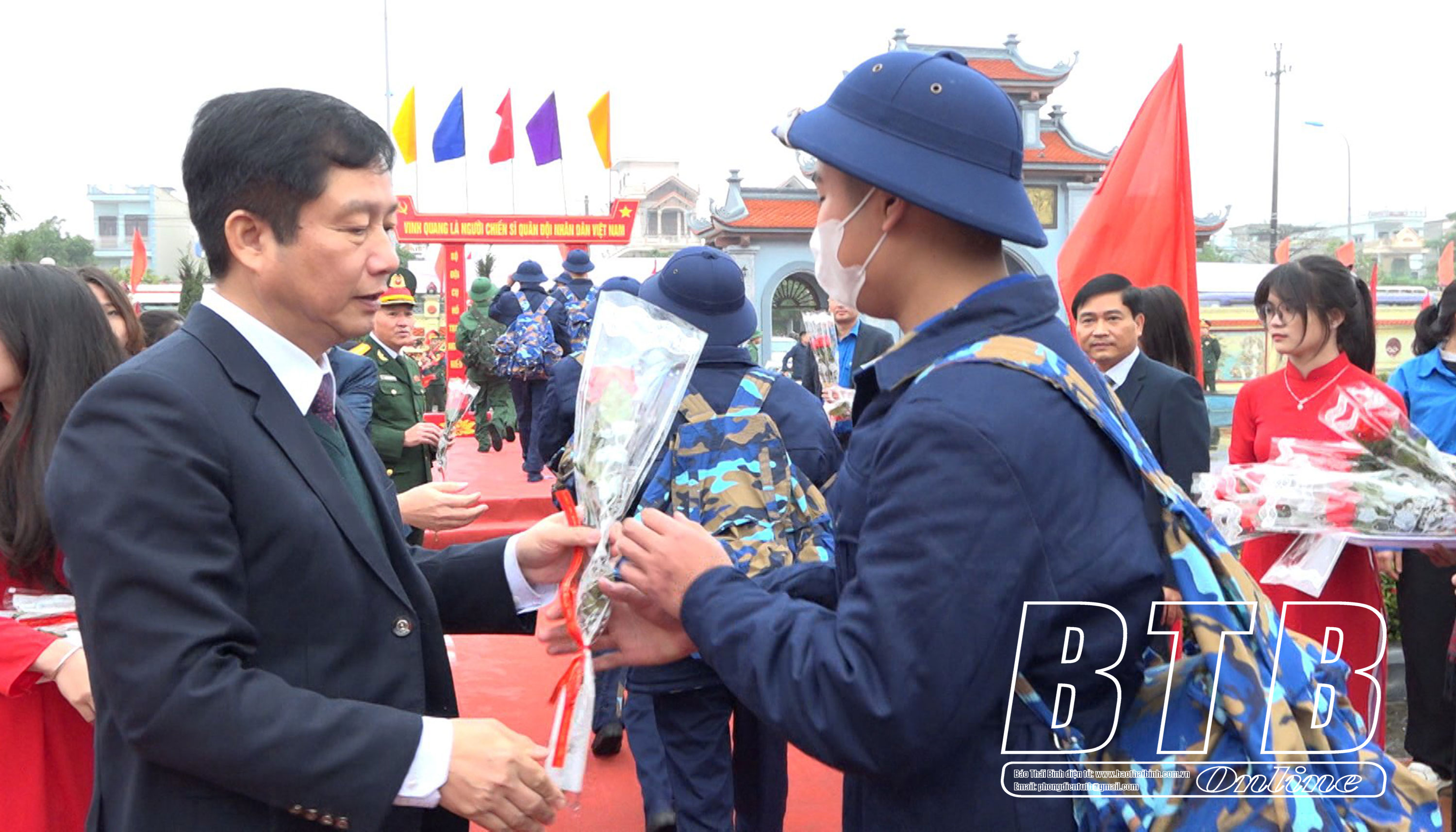 Các đồng chí lãnh đạo tỉnh, huyện Đông Hưng tạm biệt tân binh lên đường nhập ngũ.