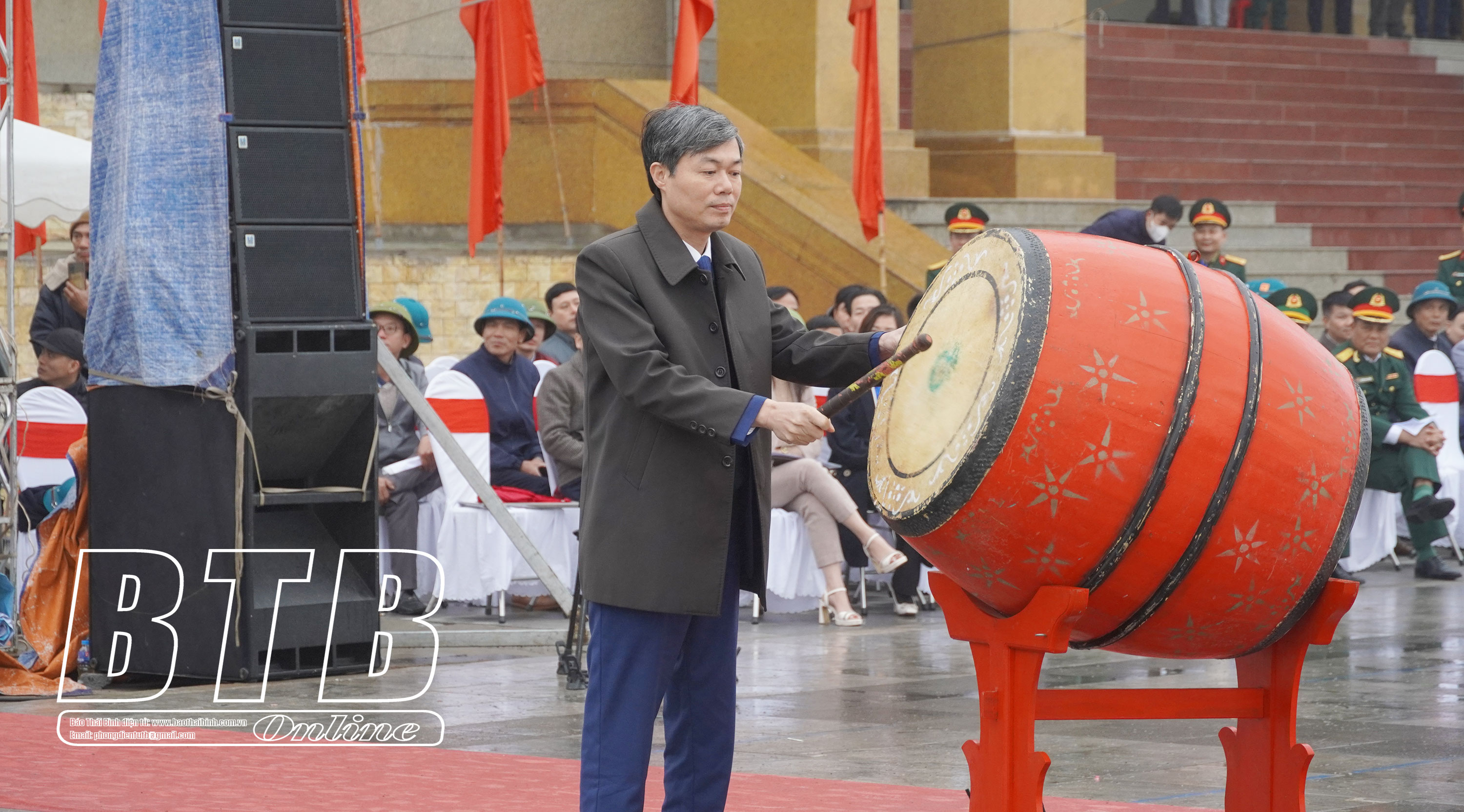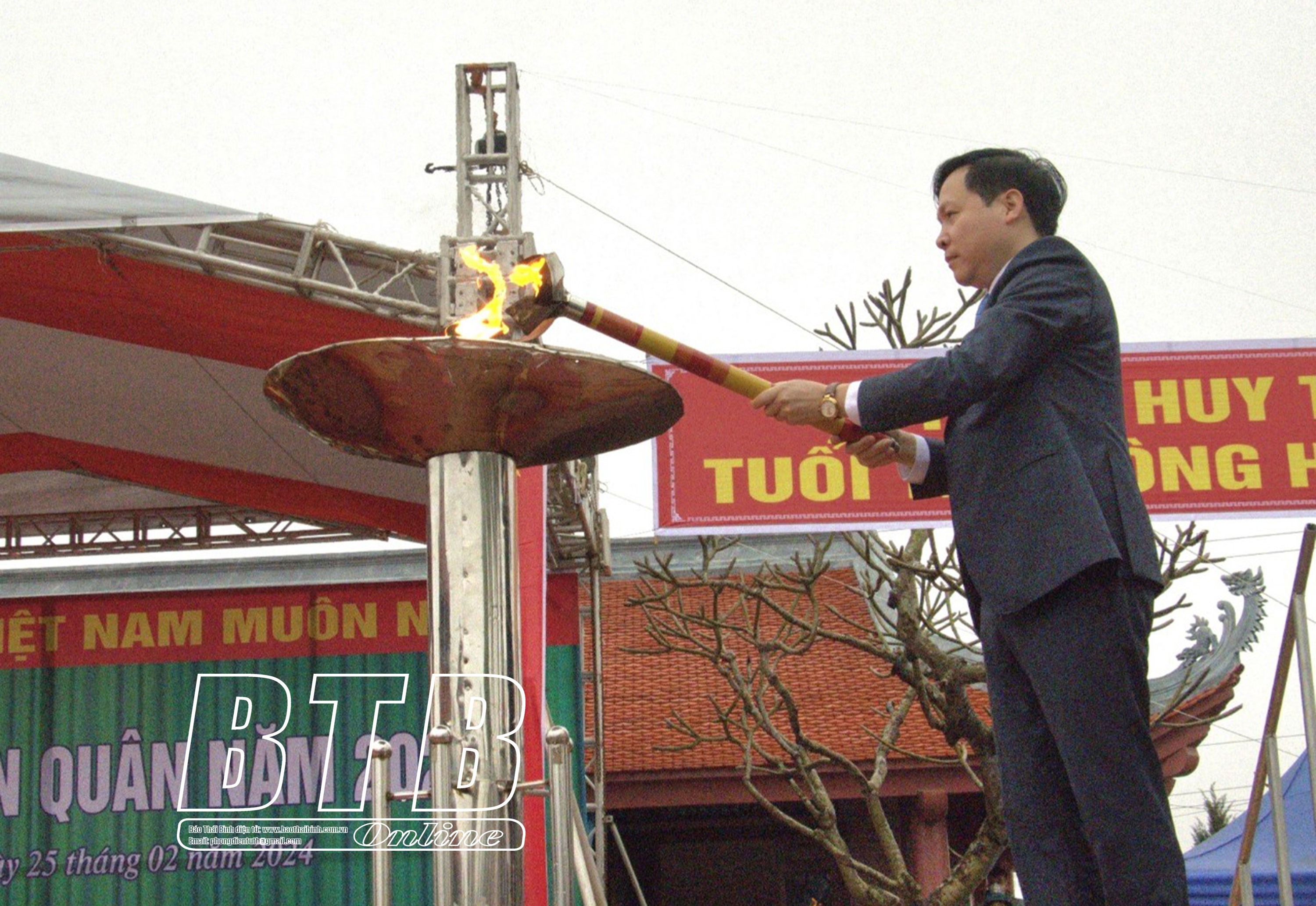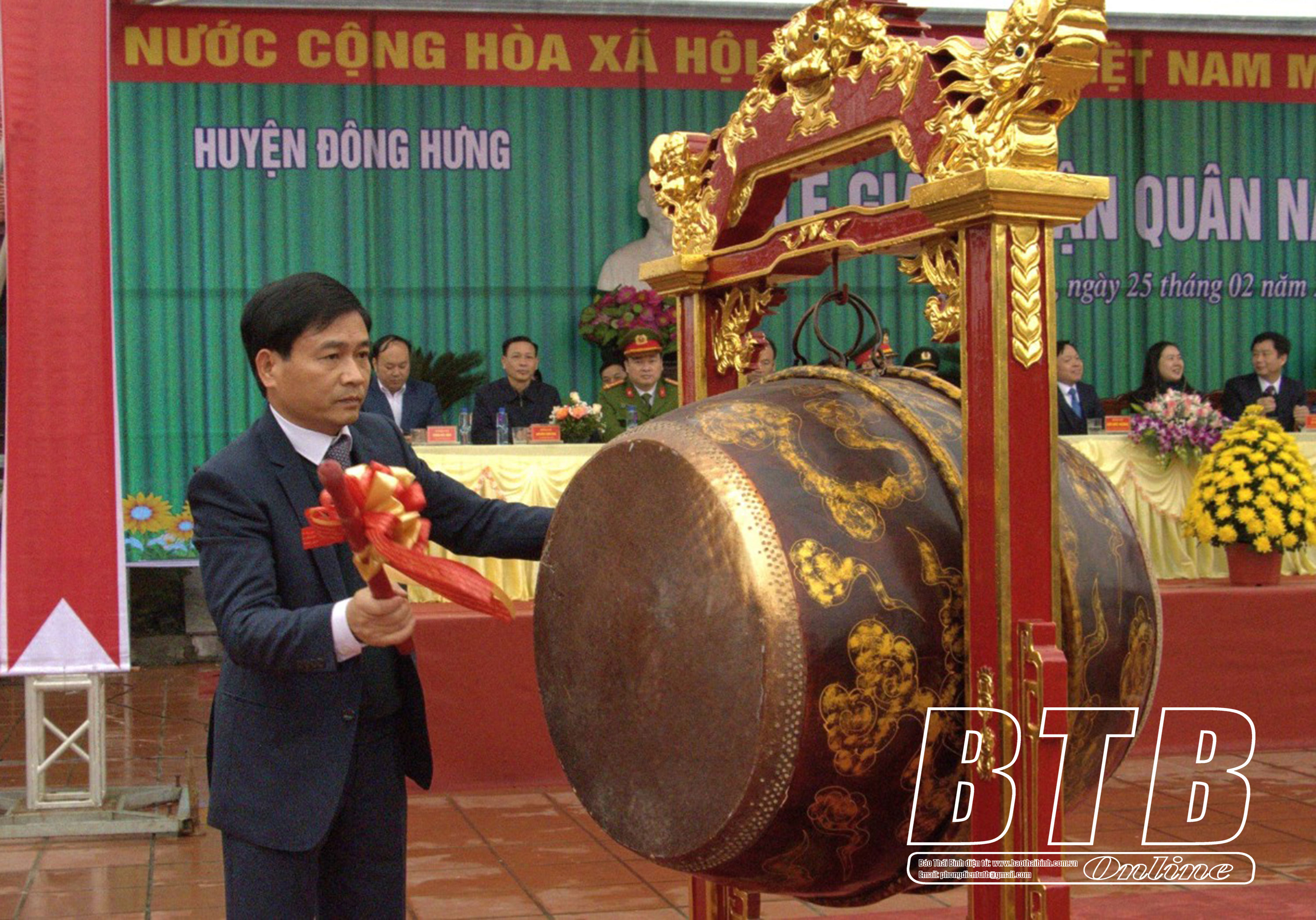 Lãnh đạo huyện Đông Hưng thắp sáng ngọn đuốc truyền thống khơi dậy khí thế, niềm tự hào trong thế hệ trẻ.Lãnh đạo huyện Đông Hưng đánh trống mở hội giao, nhận quân năm 2024.