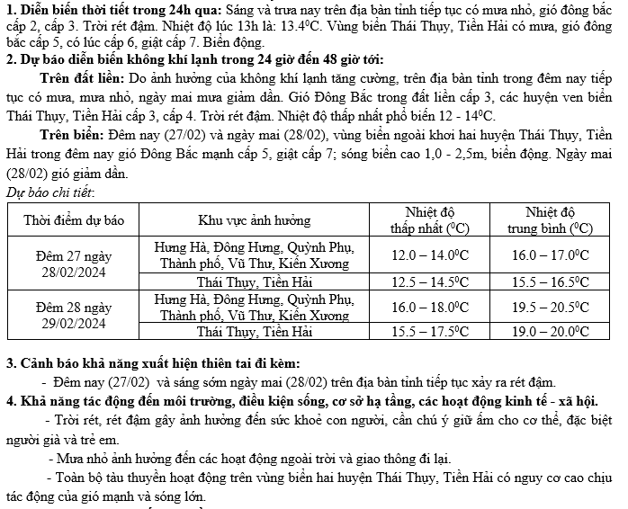 - Tin không khí lạnh tăng cường và rét tỉnh Thái Bình 26.12.2024 | 16:37 PM