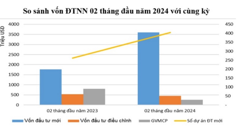 Theo đó, tính đến ngày 20/2, tổng vốn đăng ký cấp mới, điều chỉnh và góp vốn mua cổ phần, mua phần vốn góp của nhà ĐTNN đạt hơn 4,29 tỷ USD, tăng 38,6% so với cùng kỳ năm 2023. Vốn thực hiện của dự án đầu tư nước ngoài ước đạt khoảng 2,8 tỷ USD, tăng 9,8% so với cùng kỳ năm 2023.