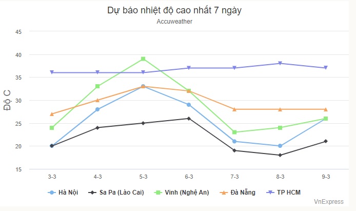 Trang Accuweather của Mỹ dự báo Hà Nội ngày mai lên 20-28 độ, đến thứ ba cao nhất lên 33 độ C. Điểm cao trên 1.500 m so với mực nước biển như Sa Pa (Lào Cai) từ nay đến giữa tuần sau nhiệt độ liên tục tăng, cao nhất 26 độ, thấp nhất 12 độ C.