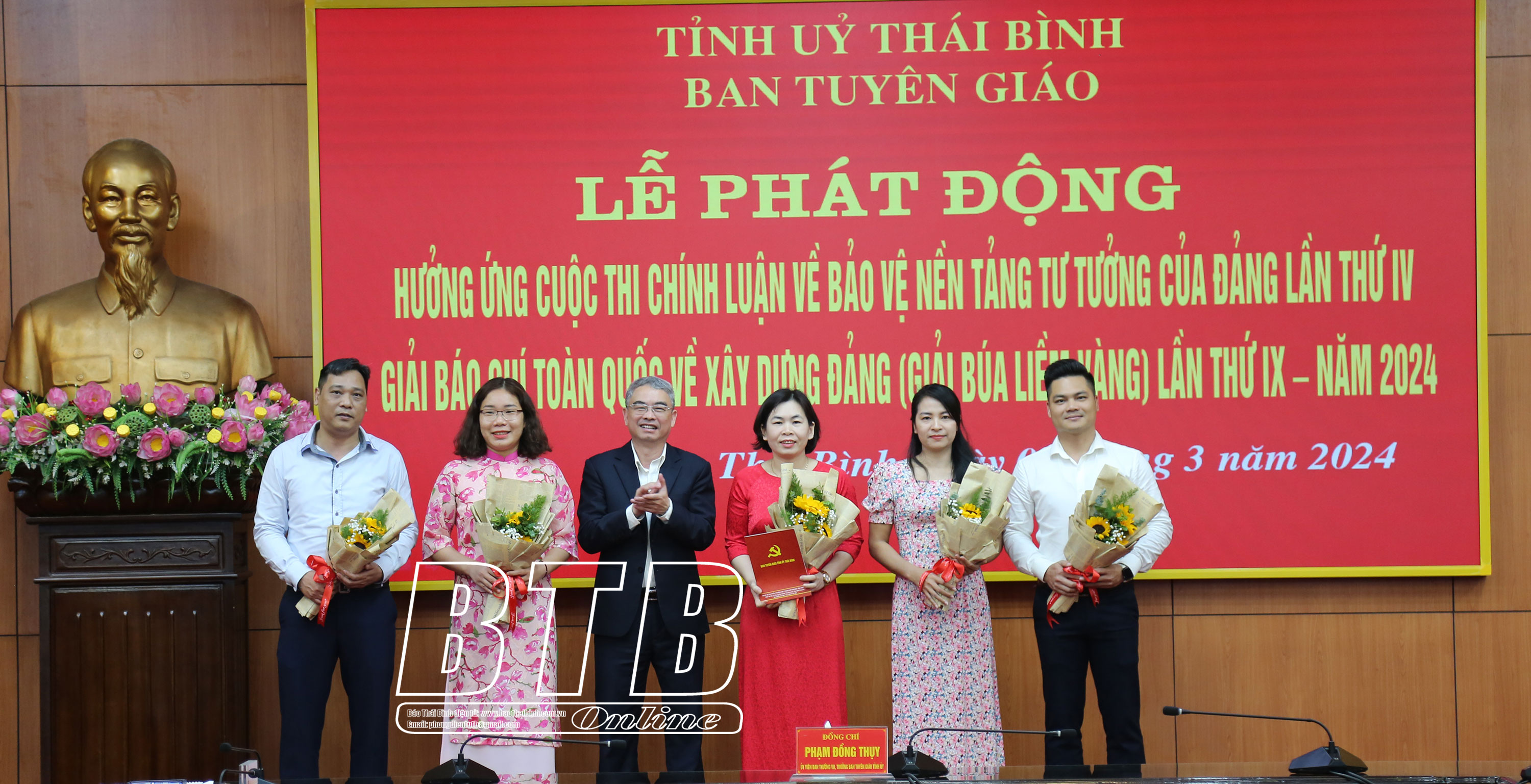 Đồng chí Phạm Đồng Thụy, Ủy viên Ban Thường vụ, Trưởng ban Tuyên giáo Tỉnh ủy, Phó Trưởng ban thường trực Ban Chỉ đạo 35 cấp tỉnh trao thưởng cho nhóm tác giả của Báo Thái Bình.