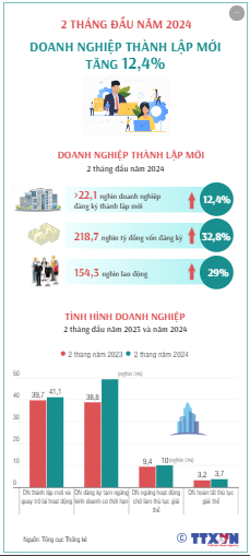 Theo Tổng cục Thống kê, trong 2 tháng đầu năm 2024, hơn 22,1 nghìn doanh nghiệp đăng ký thành lập mới với tổng số vốn đăng ký là 218,7 nghìn tỷ đồng và tổng số lao động đăng ký là 154,3 nghìn lao động, tăng 12,4% về số doanh nghiệp, tăng 32,8% về vốn đăng ký và tăng 29% về số lao động so với cùng kỳ năm trước.