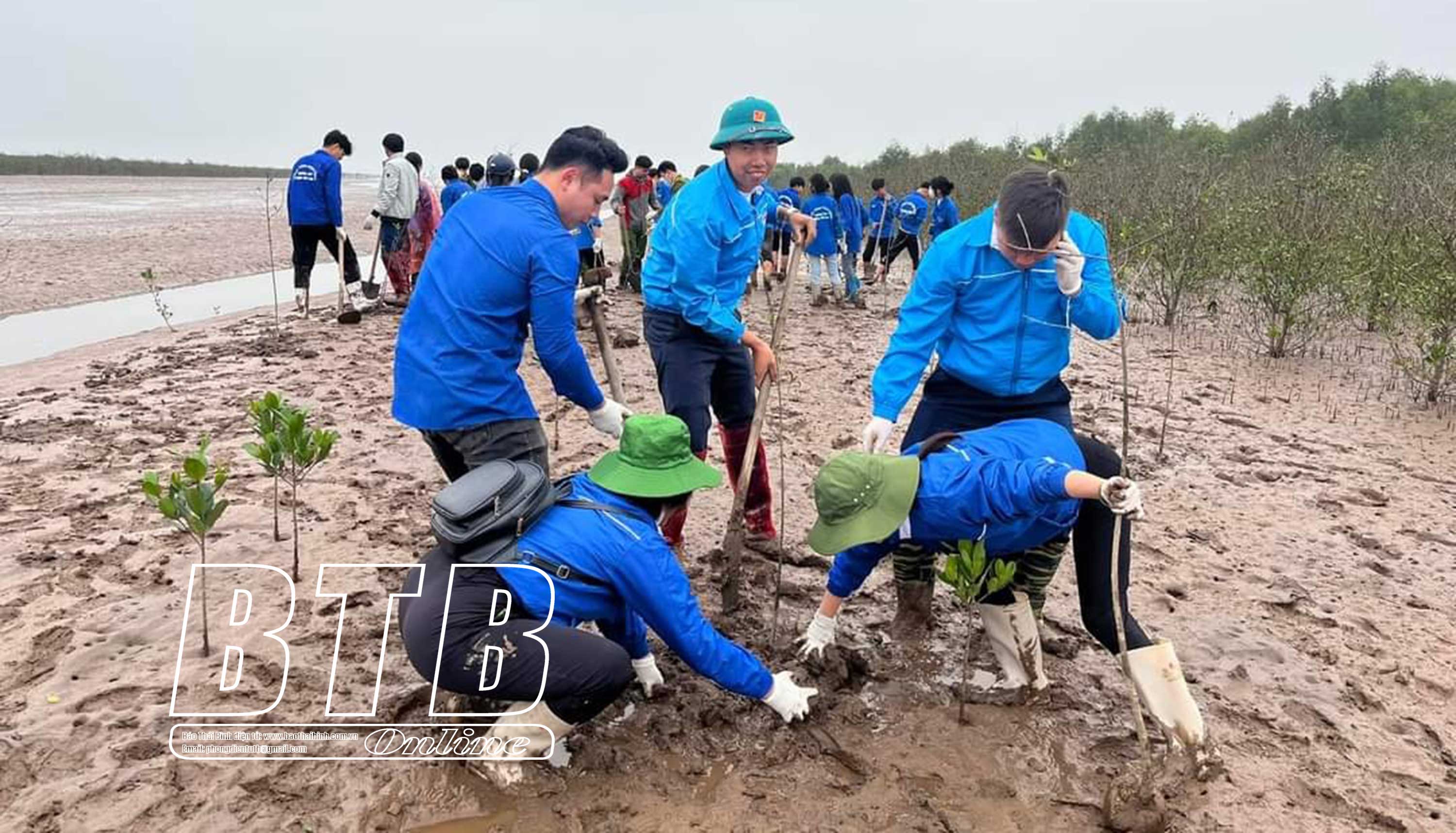 Đoàn viên, thanh niên huyện Thái Thụy tham gia trồng rừng ngập mặn ở xã Thụy Xuân.