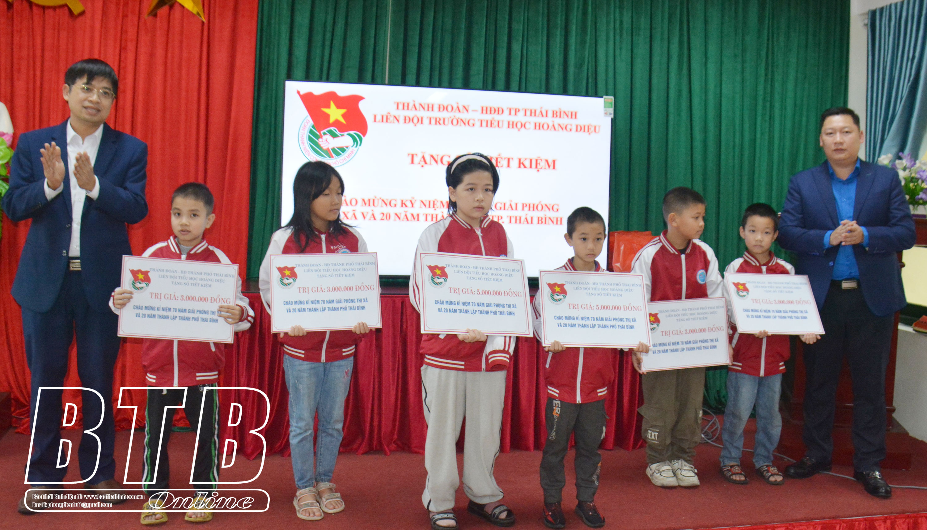 Chiều ngày 14/3, Thành đoàn, Hội đồng Đội thành phố Thái Bình, Liên đội Trường Tiểu học Hoàng Diệu trao sổ tiết kiệm cho các em học sinh của Trường Tiểu học Hoàng Diệu.