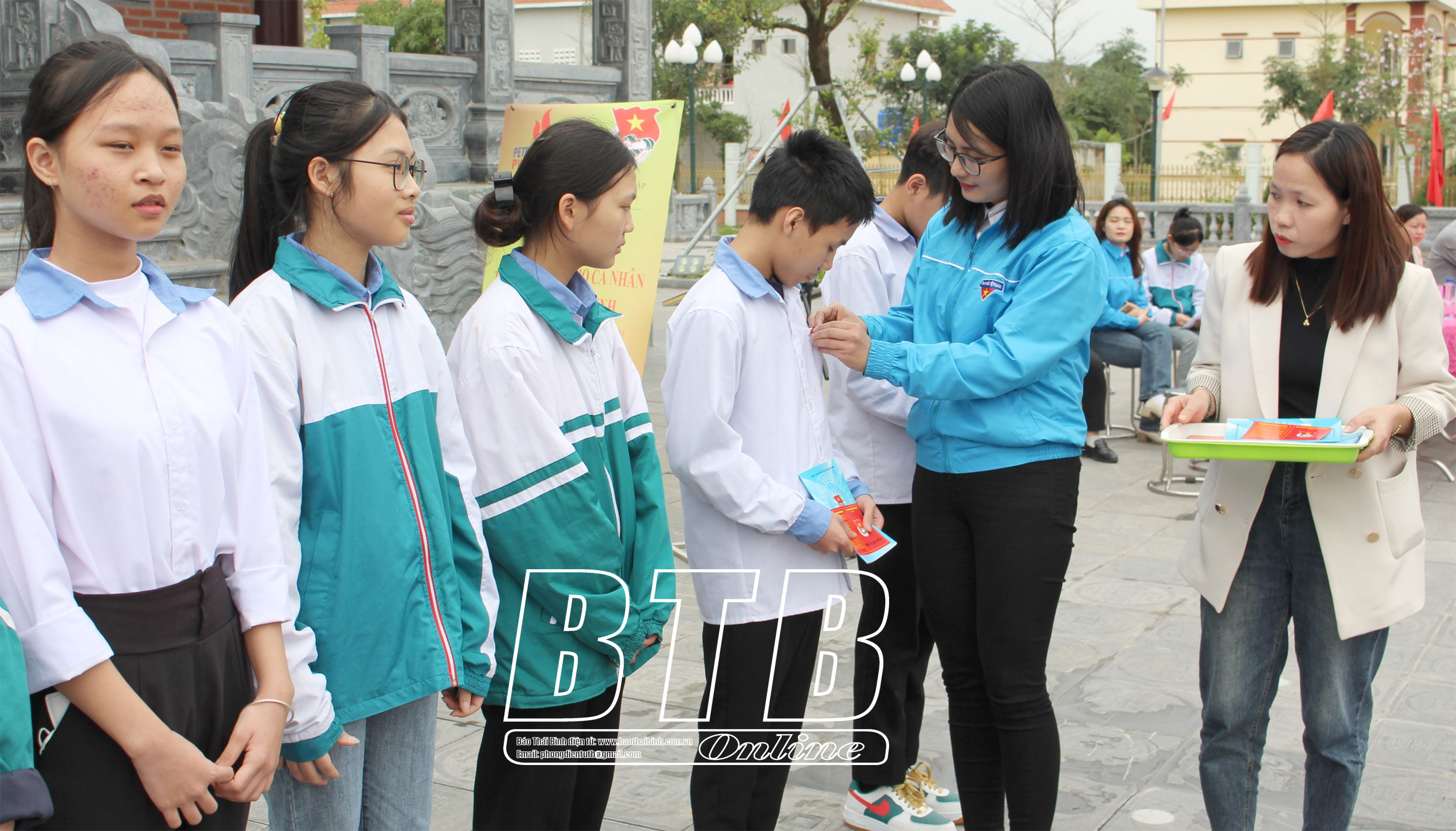 Lãnh đạo Huyện đoàn Tiền Hải trao thẻ và huy hiệu Đoàn cho đoàn viên mới.