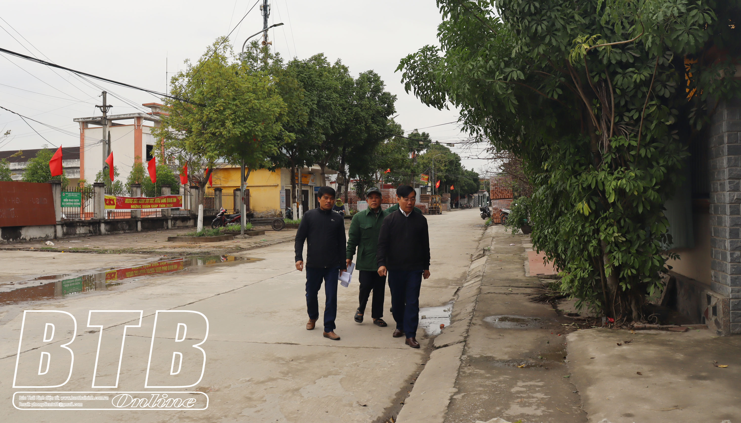 Cán bộ Phòng Nội vụ huyện Tiền Hải cùng lãnh đạo UBND xã Tây Tiến nắm bắt tình hình triển khai các nhiệm vụ sắp xếp đơn vị hành chính tại thôn Tân Lập.