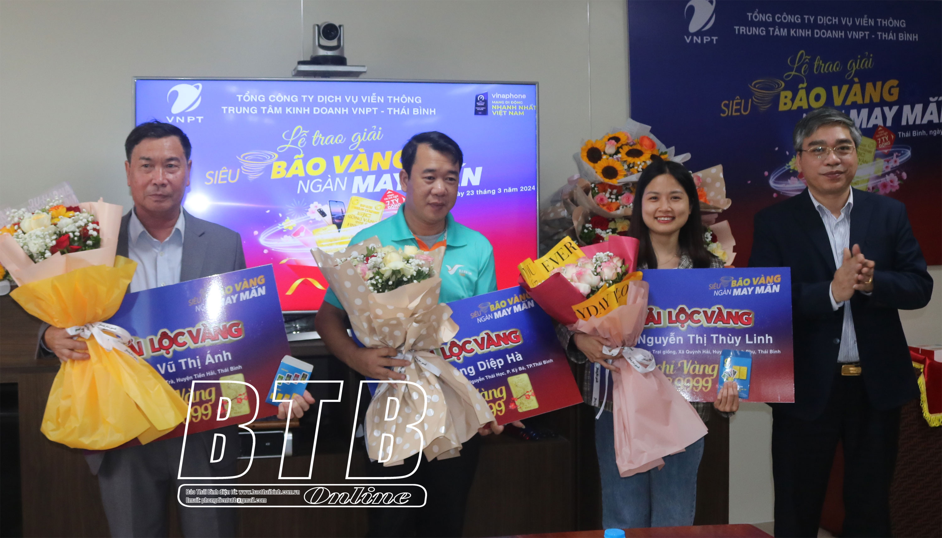 Lãnh đạo Trung tâm Kinh doanh VNPT Thái Bình trao giải lộc vàng cho 3 khách hàng may mắn trúng thưởng.