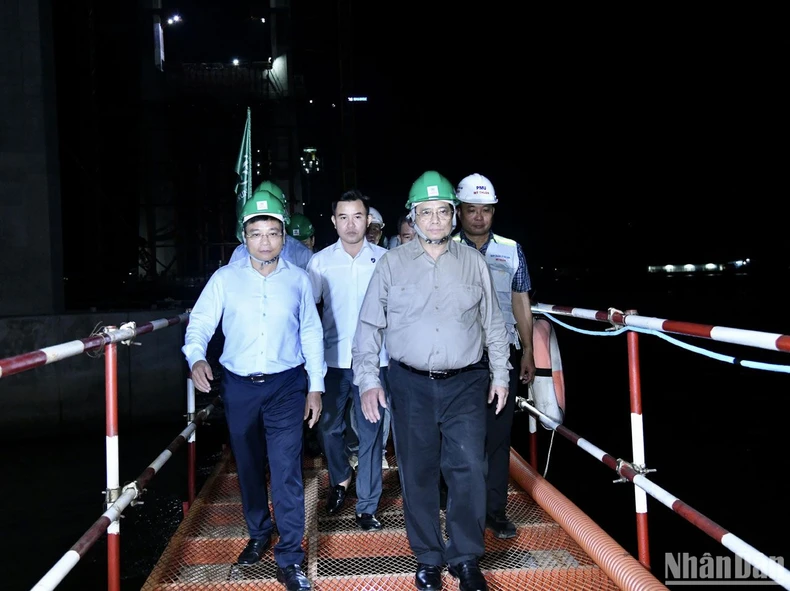 Tối cùng ngày, Thủ tướng Phạm Minh Chính đã đến khảo sát công trình và thăm, tặng quà công nhân đang thi công cầu Rạch Miễu 2 ở phía đầu Tiền Giang.