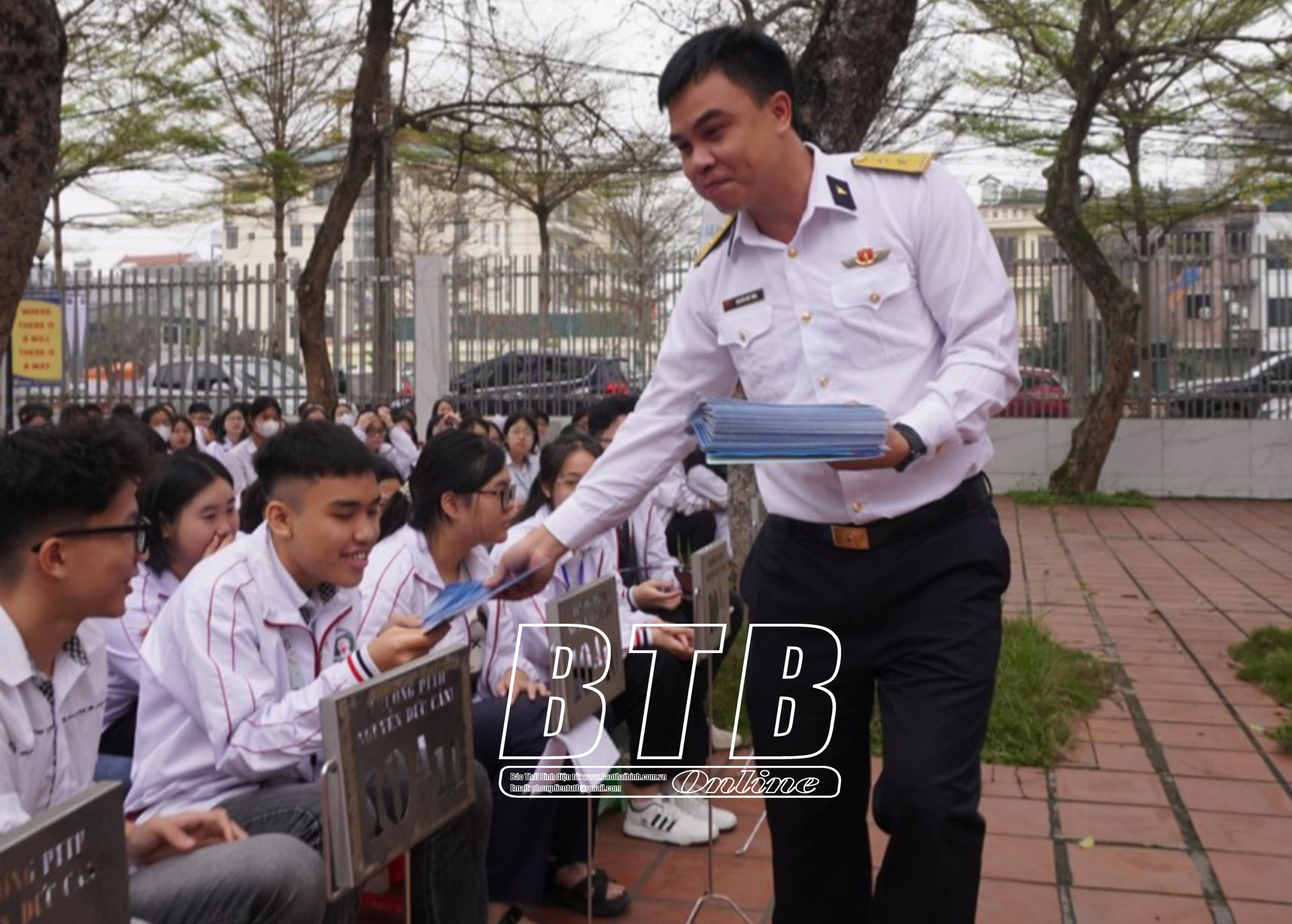 Cán bộ Lữ đoàn 679-Vùng 1 hải quân phát tài liệu tuyên truyền về biển, đảo Việt Nam cho học sinh Trường THPT Nguyễn Đức Cảnh.