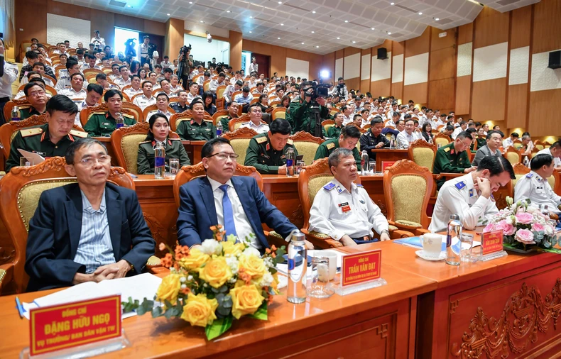 Thượng tướng Võ Minh Lương, Ủy viên Trung ương Đảng, Thứ trưởng Quốc phòng (bên phải) dự và chủ trì hội nghị.