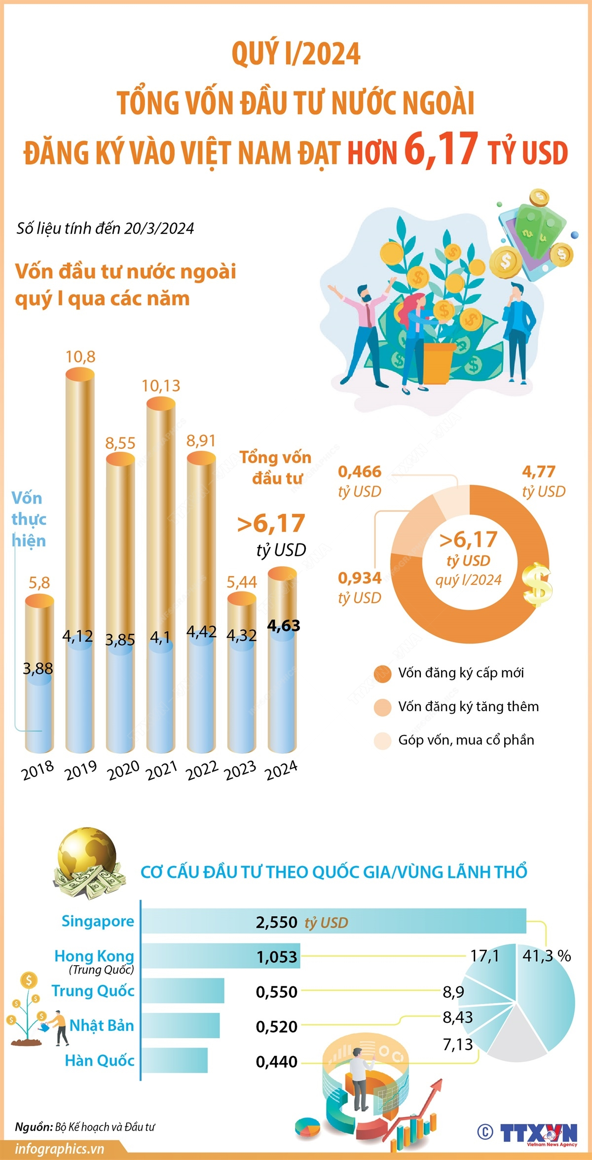 Tính đến 20/3/2024, tổng vốn đăng ký cấp mới, điều chỉnh và góp vốn mua cổ phần, mua phần vốn góp của nhà đầu tư nước ngoài đạt hơn 6,17 tỷ USD, tăng 13,4% so với cùng kỳ năm 2023.
