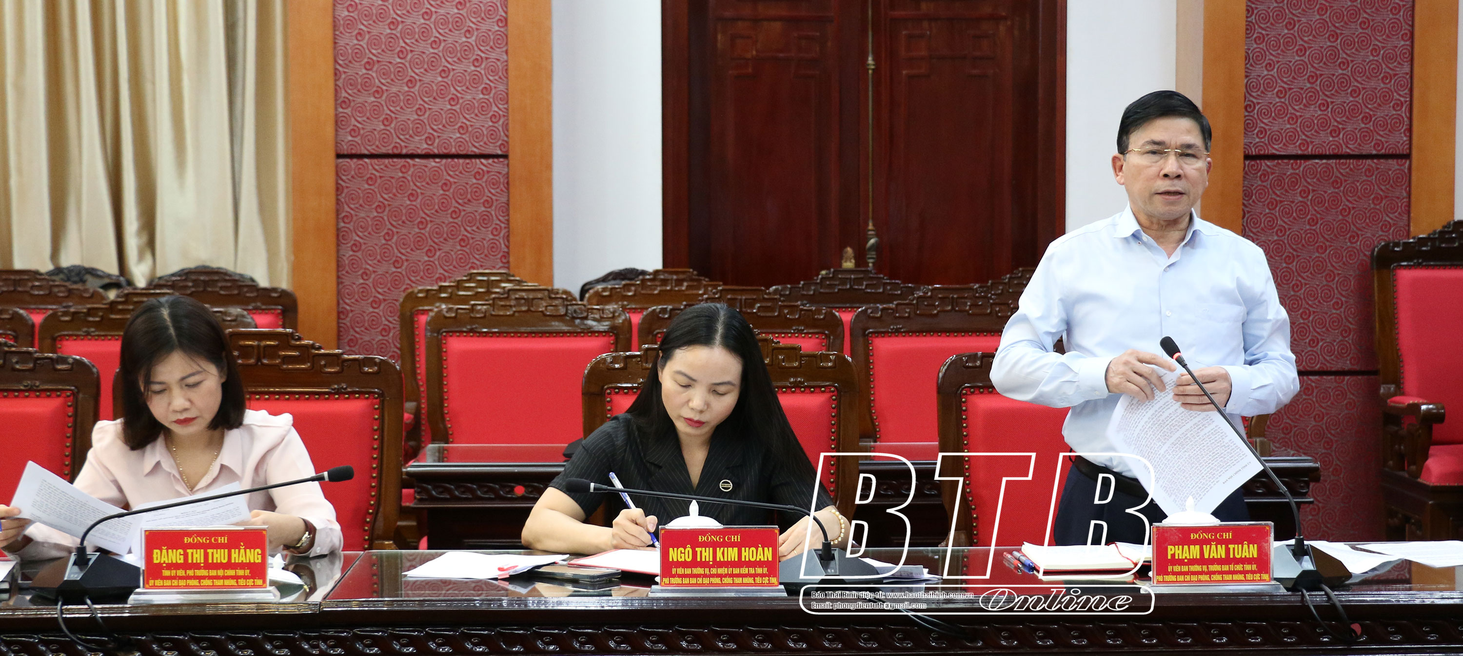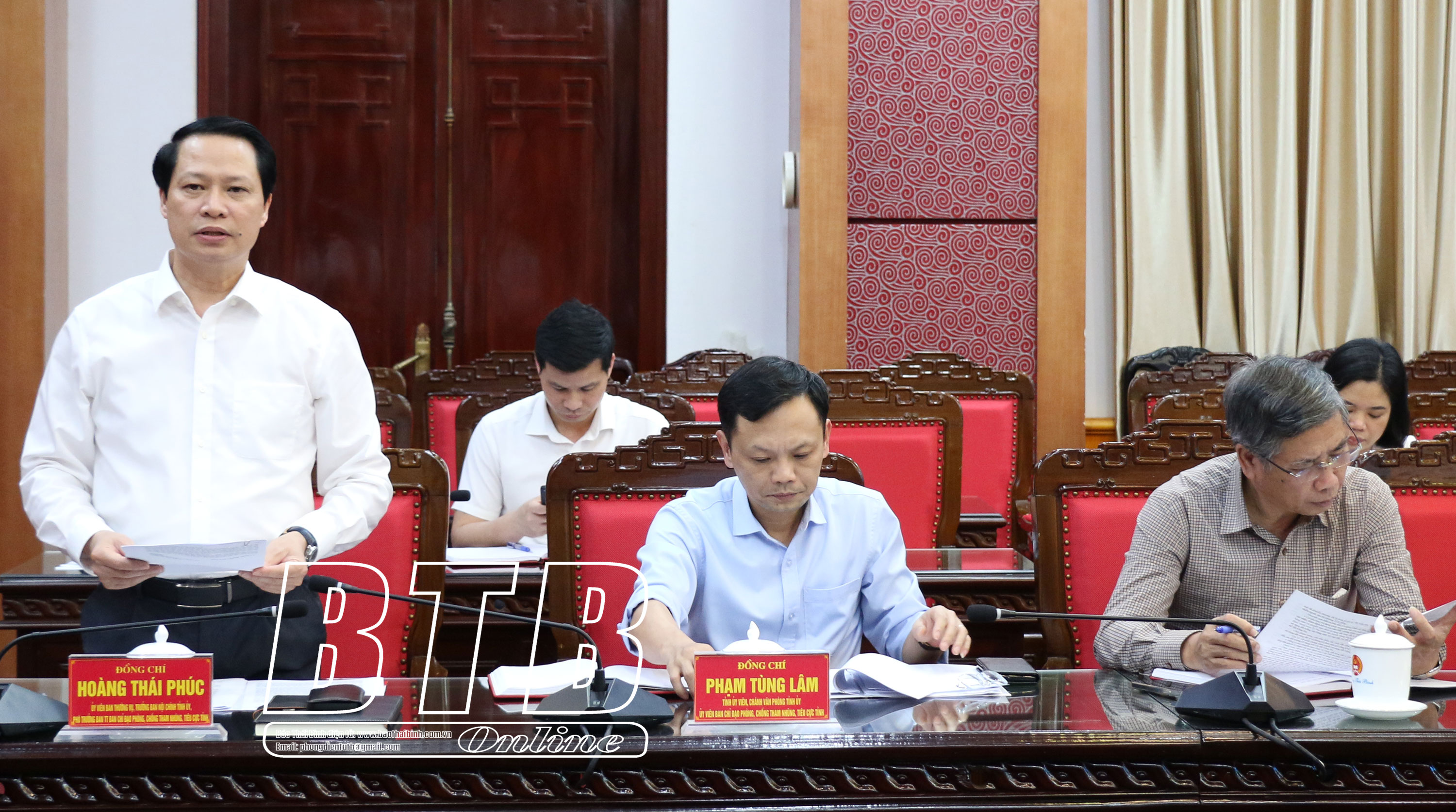 Đồng chí Hoàng Thái Phúc, Ủy viên Ban Thường vụ, Trưởng ban Nội chính Tỉnh ủy, Phó Trưởng ban thường trực Ban Chỉ đạo tỉnh phát biểu tại cuộc họp. Đồng chí Phạm Văn Tuân, Ủy viên Ban Thường vụ, Trưởng ban Tổ chức Tỉnh ủy, Phó Trưởng ban Chỉ đạo tỉnh phát biểu tại cuộc họp.