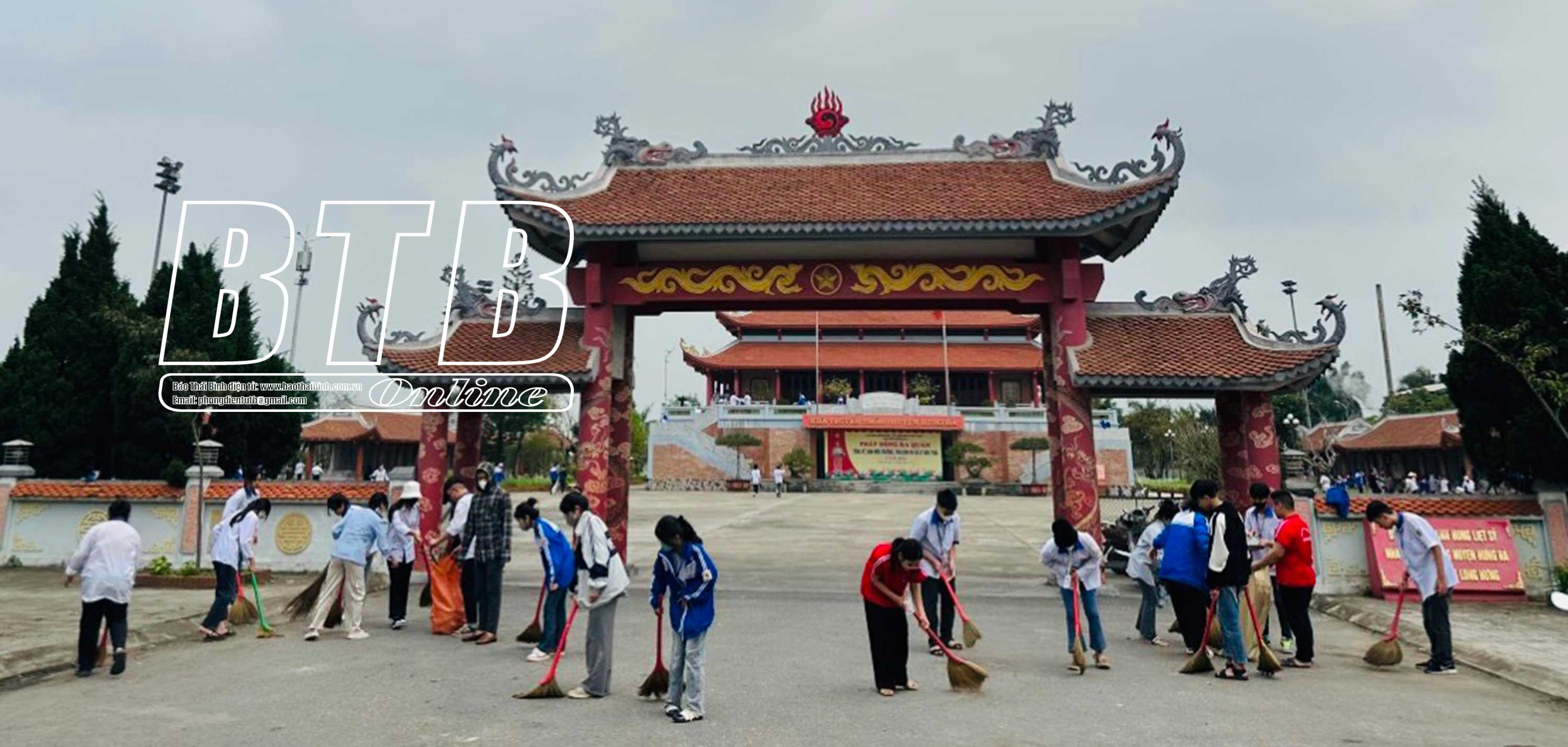 Các đoàn viên thanh niên tham gia dọn dẹp khuôn viên quảng trường Long Hưng thị trấn Hưng Hà.