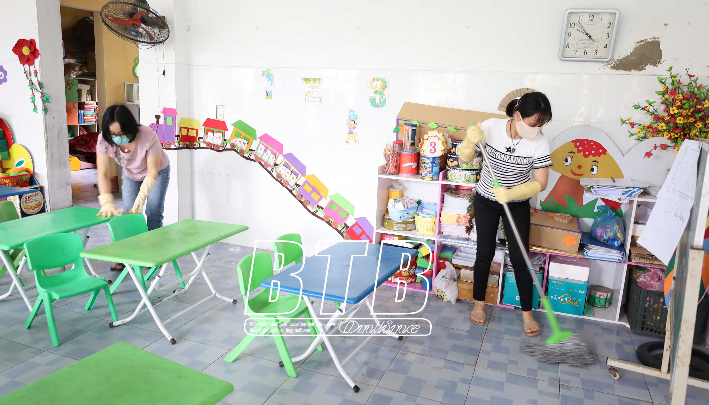 Giáo viên Trường Mầm non Trần Thái Tông vệ sinh lớp học hàng ngày.