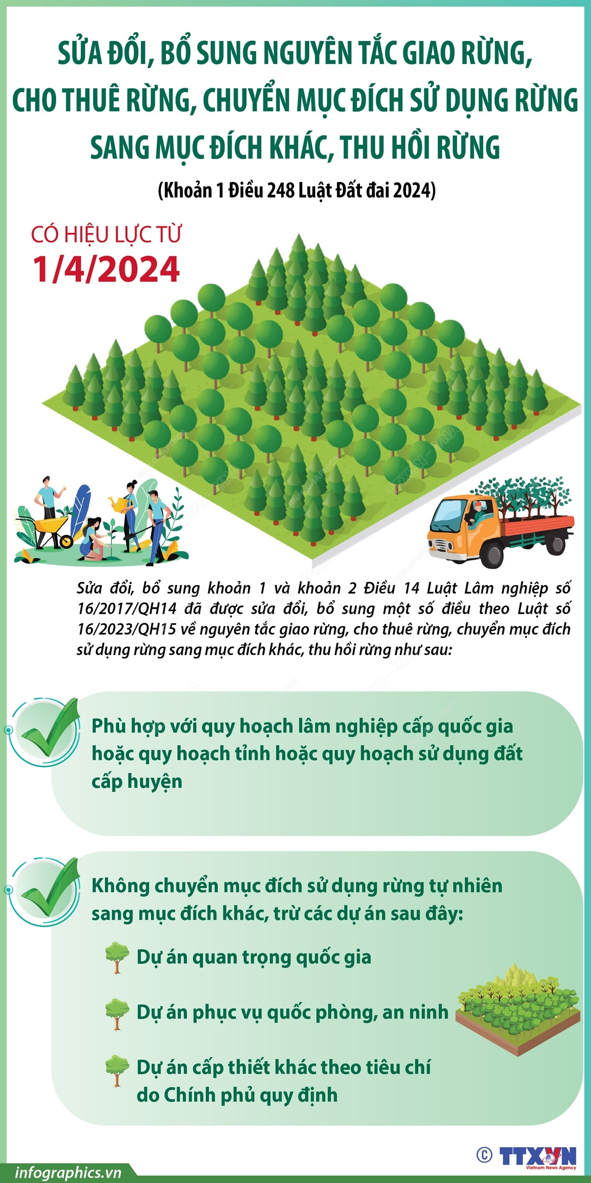 Từ 1/4/2024, Điều 248 Luật Đất đai 2024 Sửa đổi, bổ sung một số điều của Luật Lâm nghiệp số 16/2017/QH14 đã được sửa đổi, bổ sung một số điều theo Luật số 16/2023/QH15 chính thức có hiệu lực. Theo đó, khoản 1 và khoản 2 Điều 14 Luật Lâm nghiệp về nguyên tắc giao rừng, cho thuê rừng, chuyển mục đích sử dụng rừng sang mục đích khác, thu hồi rừng được sửa đổi, bổ sung như sau: Phù hợp với quy hoạch lâm nghiệp cấp quốc gia hoặc quy hoạch tỉnh hoặc quy hoạch sử dụng đất cấp huyện; Không chuyển mục đích sử dụng rừng tự nhiên sang mục đích khác, trừ các dự án sau đây: dự án quan trọng quốc gia; dự án phục vụ quốc phòng, an ninh; dự án cấp thiết khác theo tiêu chí do Chính phủ quy định.
