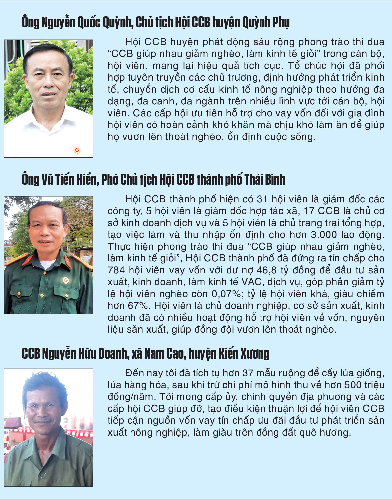 Không chỉ hội viên Vũ Đình Hiển làm kinh tế giỏi, trên địa bàn tỉnh còn nhiều tấm gương CCB tiêu biểu trên mặt trận phát triển kinh tế. Hiện toàn tỉnh có 36 hội viên CCB tham gia tích tụ ruộng đất cấy lúa, trồng cây dược liệu với tổng diện tích hơn 180ha; hơn 2.300 hộ CCB chăn nuôi trâu, bò theo mô hình chuỗi liên kết với trên 5.800 con. Hội viên CCB làm chủ hơn 1.000 doanh nghiệp, cơ sở sản xuất, trang trại, gia trại, tạo việc làm cho gần 20.000 lao động. Đời sống của hội viên CCB không ngừng được cải thiện và nâng lên. Tỷ lệ hội viên nghèo giảm bình quân 0,2%/năm, hết năm 2023 có 93/260 xã, phường, thị trấn không còn gia đình hội viên CCB nghèo.
