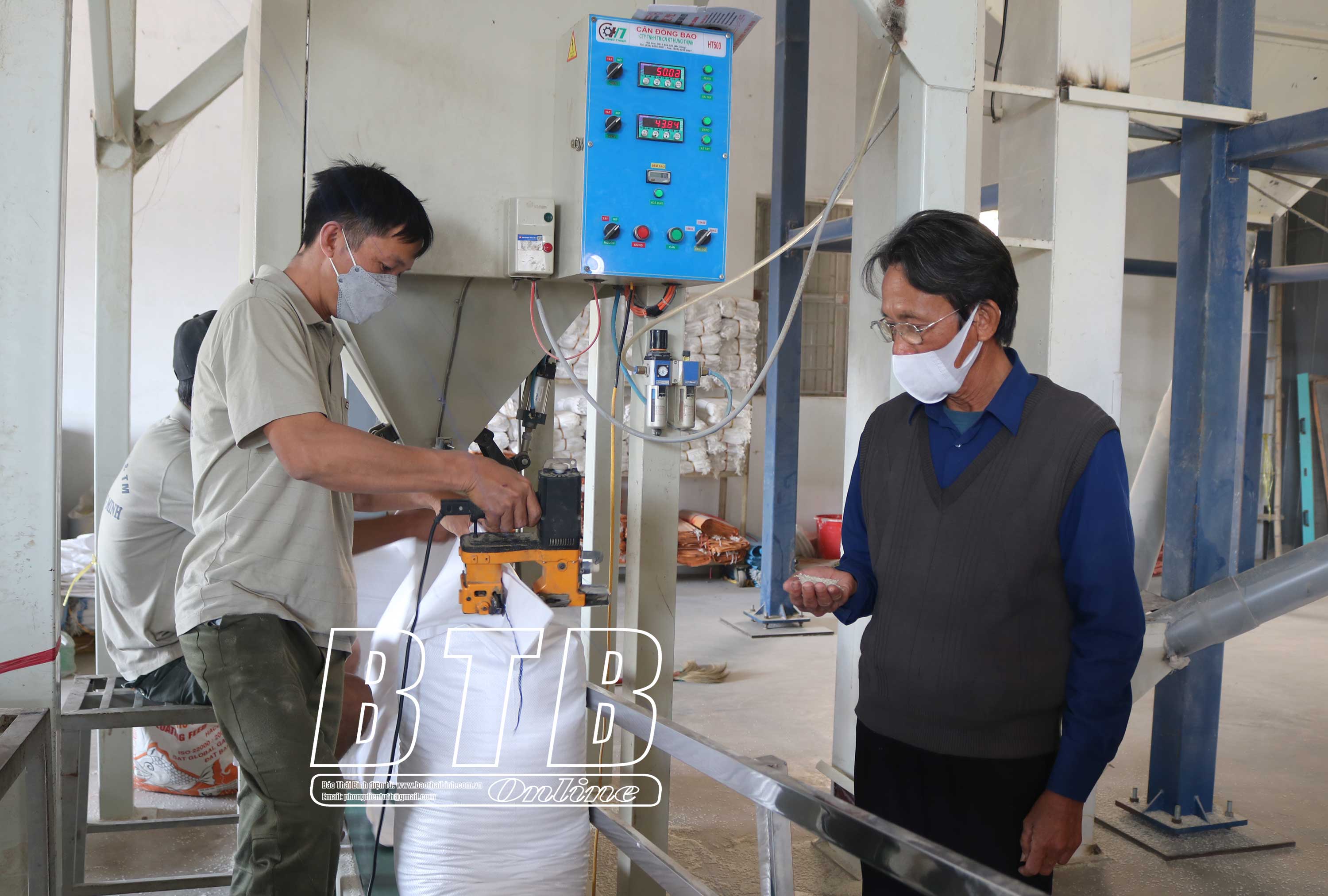 Nhà máy xay xát gạo của cựu chiến binh Đỗ Văn Tải (người bên phải), xã Đồng Tiến (Quỳnh Phụ) tạo việc làm cho hàng chục lao động địa phương.