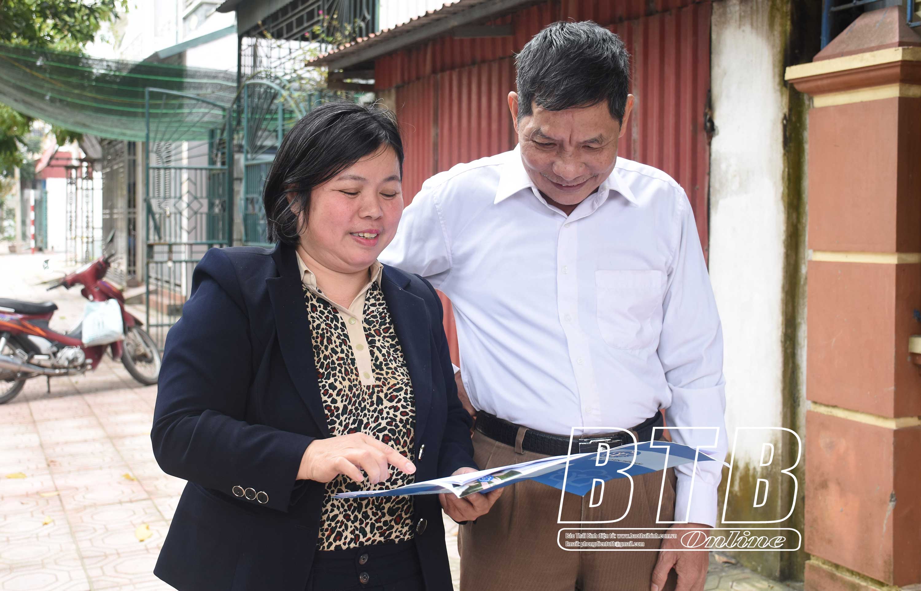 Viên chức BHXH huyện Tiền Hải tuyên truyền về các tiện ích khi sử dụng thẻ ATM để lĩnh lương hưu.