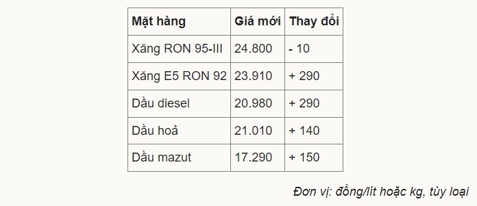 Giá xăng, dầu thay đổi như sau: