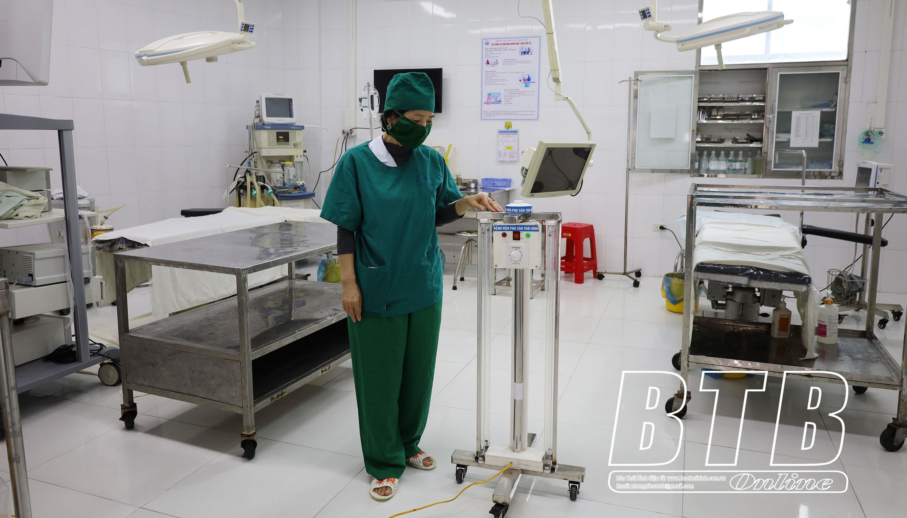 Hệ thống đèn chiếu tia cực tím tự động được đặt để khử khuẩn trong phòng mổ của Bệnh viện Phụ sản Thái Bình.