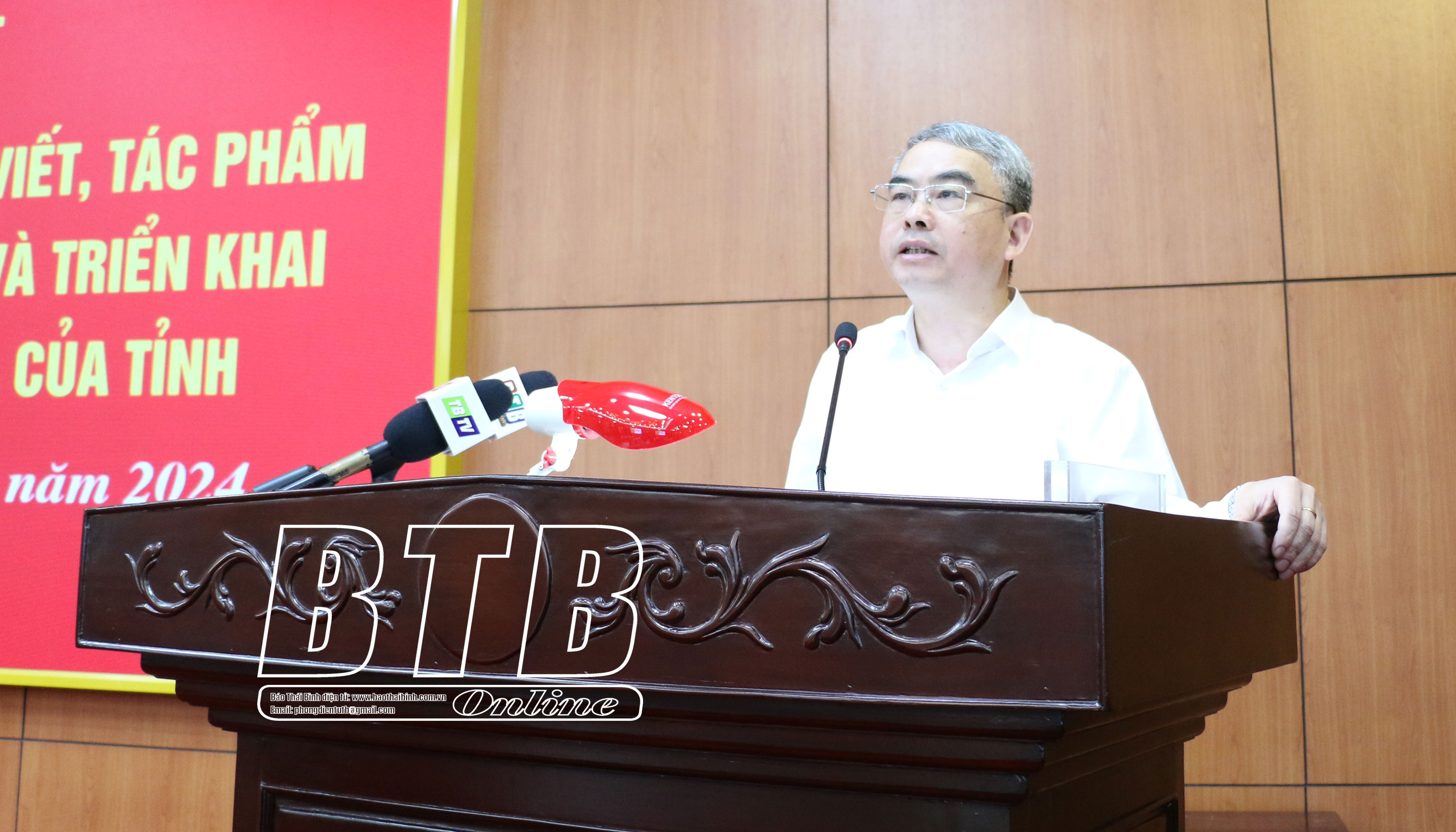 Đồng chí Phạm Đồng Thụy, Ủy viên Ban Thường vụ, Trưởng ban Tuyên giáo Tỉnh ủy giới thiệu nội dung bài viết, tác phẩm của Tổng Bí thư Nguyễn Phú Trọng. Ảnh: Đào Quyên