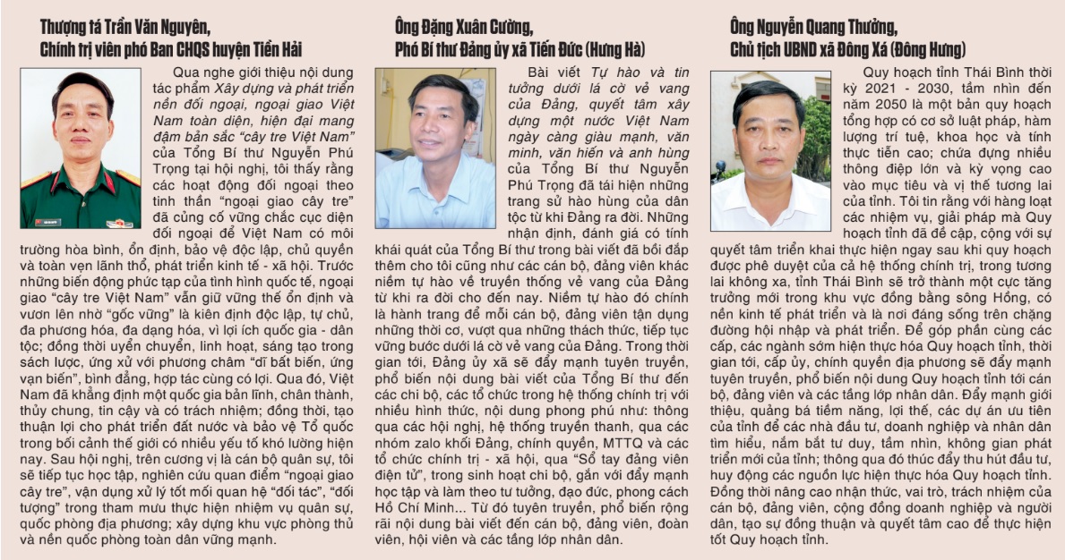 Đồng chí đề nghị sau hội nghị, các cấp ủy, tổ chức đảng, địa phương, cơ quan, đơn vị tiếp tục tuyên truyền, phổ biến, quán triệt nội dung bài viết, tác phẩm của Tổng Bí thư Nguyễn Phú Trọng; Quy hoạch tỉnh Thái Bình thời kỳ 2021 - 2030, tầm nhìn đến năm 2050 và các chỉ thị, kết luận của Bộ Chính trị, Ban Bí thư  tới cán bộ, đảng viên và các tầng lớp nhân dân; xây dựng các kế hoạch, chương trình hành động sát, đúng với thực tiễn của cơ quan, địa phương, đơn vị. Mỗi cán bộ, đảng viên phải nêu cao tinh thần trách nhiệm, xác định rõ nhiệm vụ của bản thân để triển khai thực hiện cho tốt. Các ban của Đảng, cơ quan ủy ban kiểm tra, cấp ủy các cấp thường xuyên theo dõi, giám sát, đánh giá kết quả thực hiện của từng tổ chức đảng và cán bộ, đảng viên.