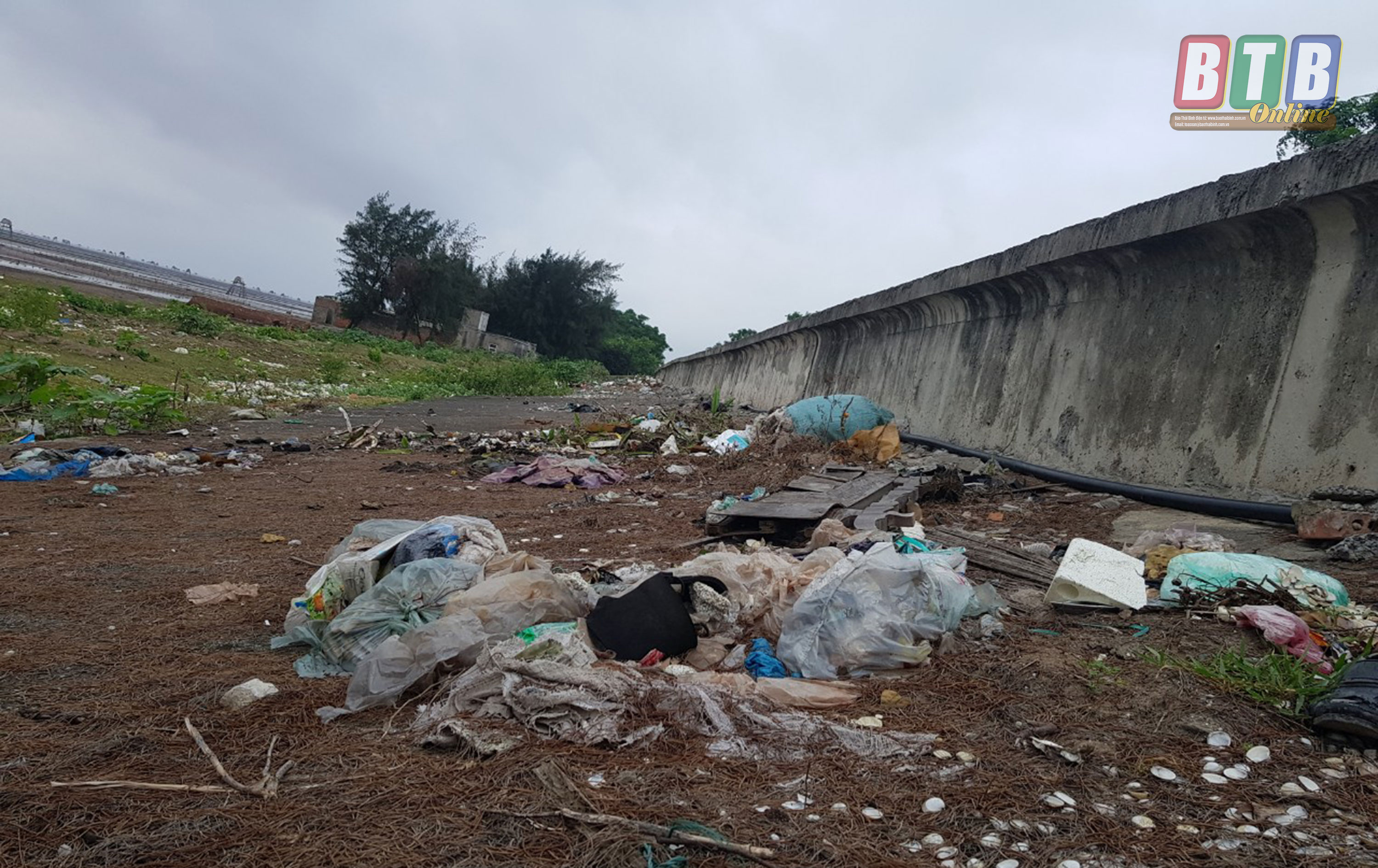 Không chỉ dưới bãi biển mà dọc triền đê cũng phủ đầy những rác sinh hoạt do những người dân thiếu ý thức trực tiếp xả ra môi trường. Thậm chí ở đây có cả những chai lọ thủy tinh vỡ mà chỉ cần sơ xuất cũng có thể cứa đứt da thịt.