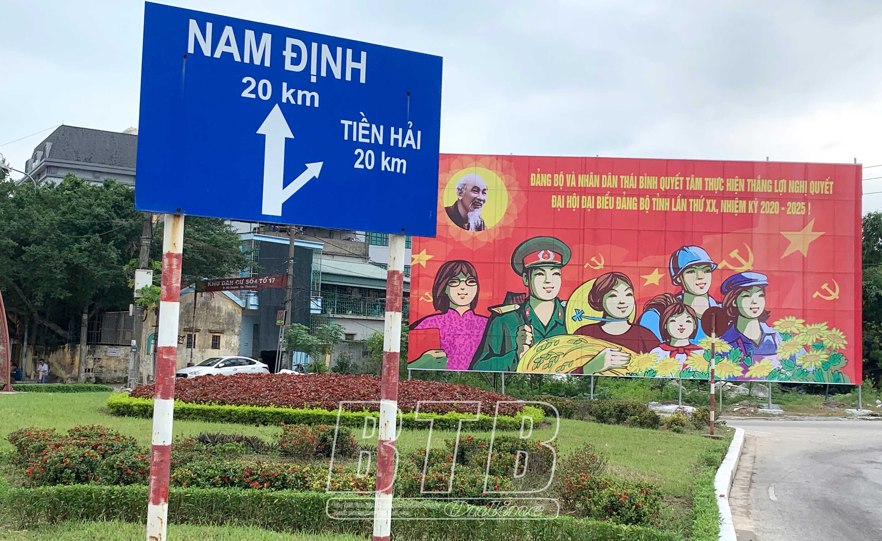 Tất cả các cửa ngõ dẫn vào thành phố Thái Bình, các vòng xuyến, nút giao thông đều ngập trong sắc đỏ của cờ, hoa chào mừng Đại hội.
