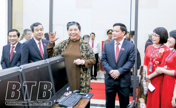 Đồng chí Tòng Thị Phóng, Ủy viên Bộ Chính trị, Phó Chủ tịch thường trực Quốc hội và các đồng chí lãnh đạo tỉnh thăm trung tâm báo chí tại Đại hội.