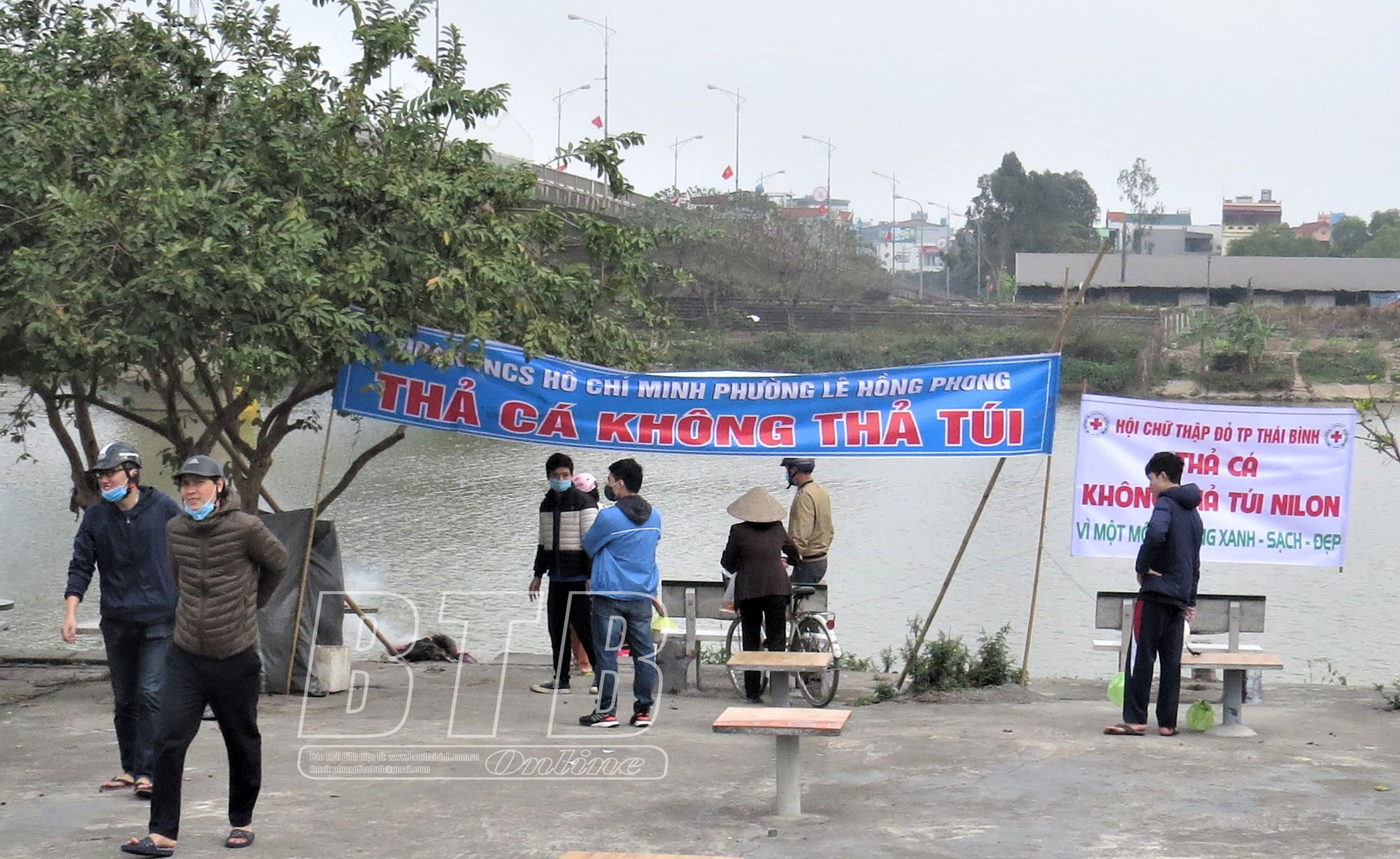 Băng rôn tuyên truyền "Thả cá không thả túi nilong" được treo tại bờ sông Trà Lý và trên thành cầu với mong muốn mọi người chung tay giữ gìn vệ sinh môi trường.