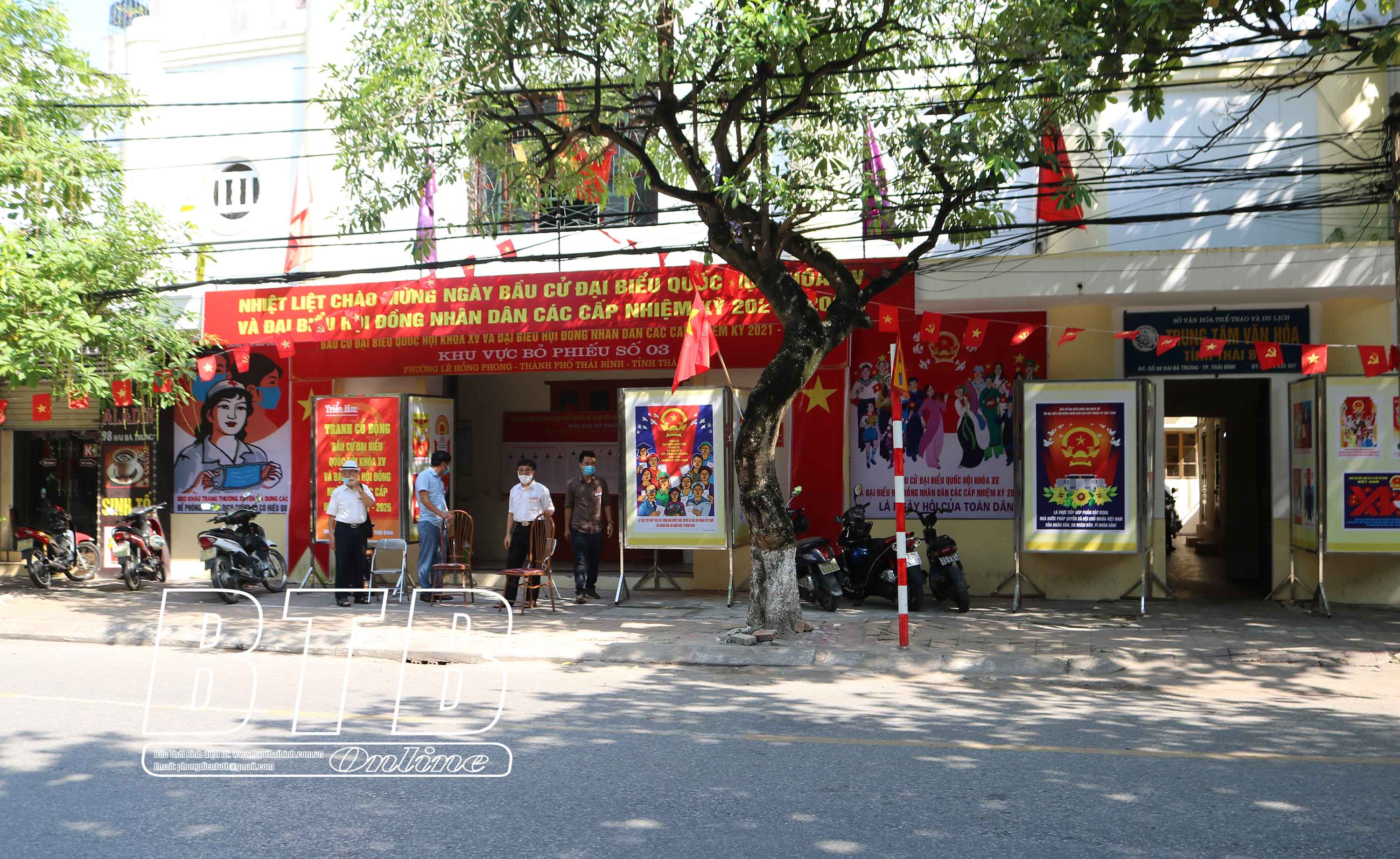 Khu vực bỏ phiếu số 3, phường Lê Hồng Phong, thành phố Thái Bình được trang hoàng rực rỡ.