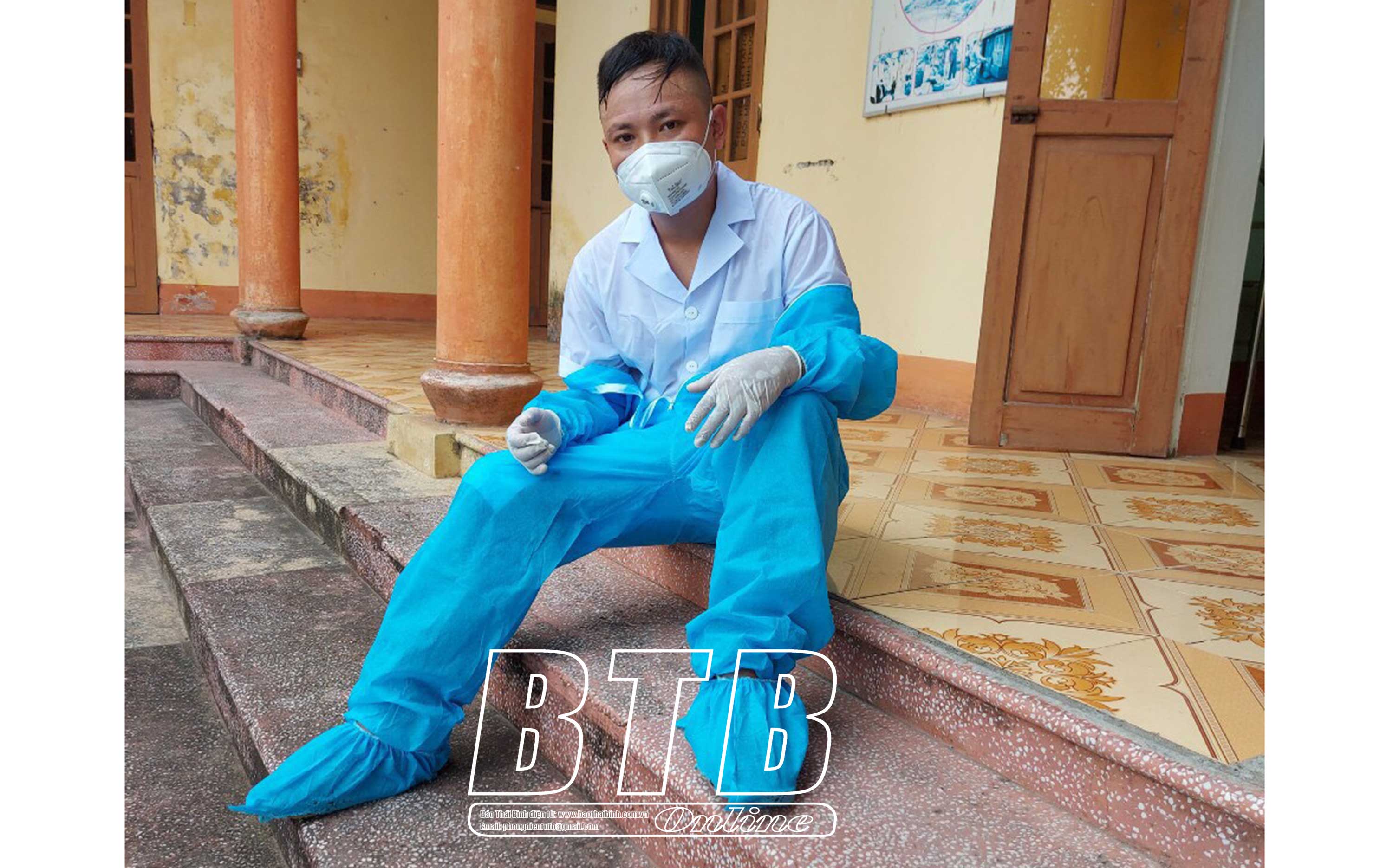 Nhân viên y tế huyện Đông Hưng sau một buổi mặc bộ đồ bảo hộ để làm nhiệm vụ.