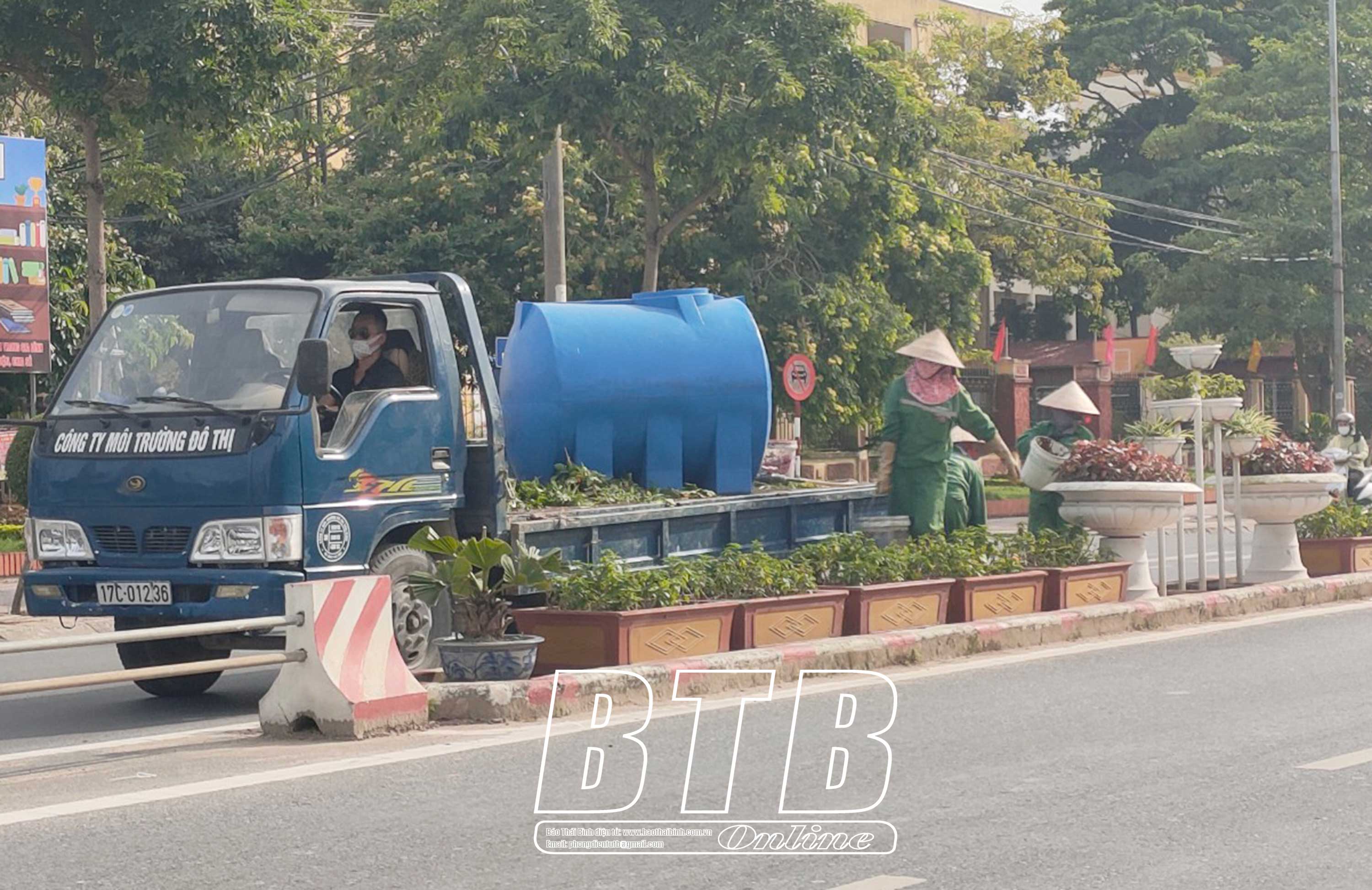 Công nhân Công ty Cổ phần Môi trường và Công trình đô thị Thái Bình nỗ lực tưới nước cho cây, hoa chống chọi với nắng nóng.