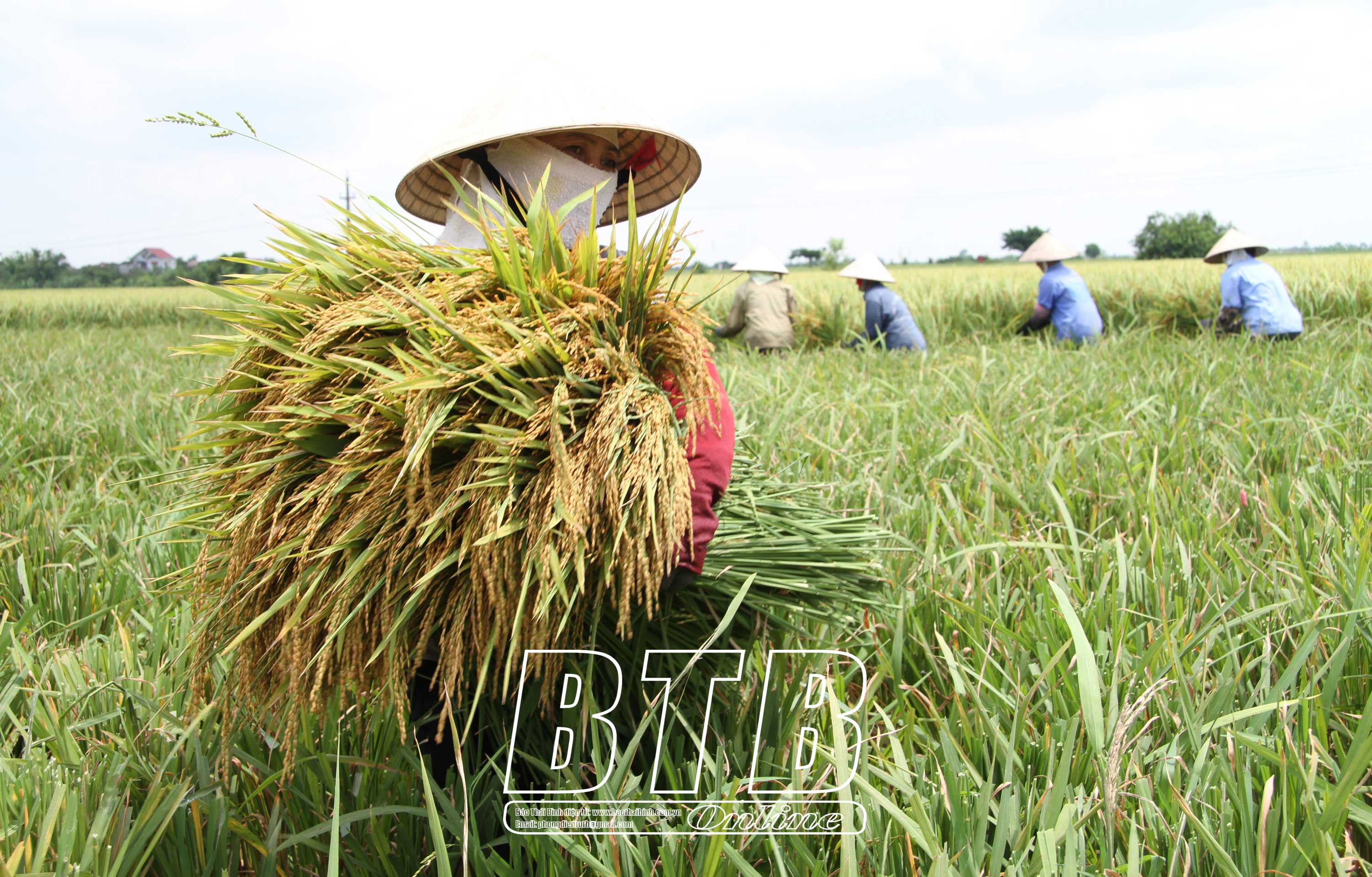 Nông dân Quỳnh Phụ tranh thủ thu hoạch lúa vào buổi sáng để tránh nắng nóng