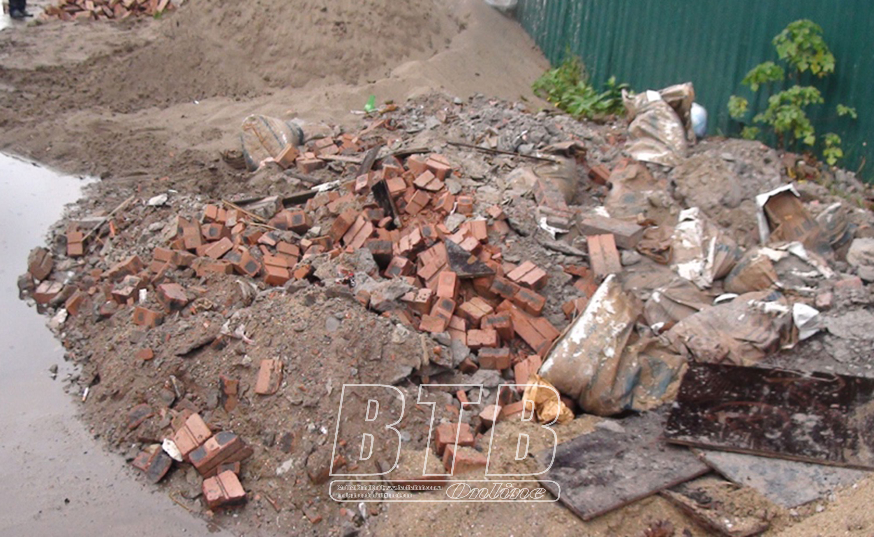 Rác thải xây dựng đổ tràn lan xuống lòng đường.