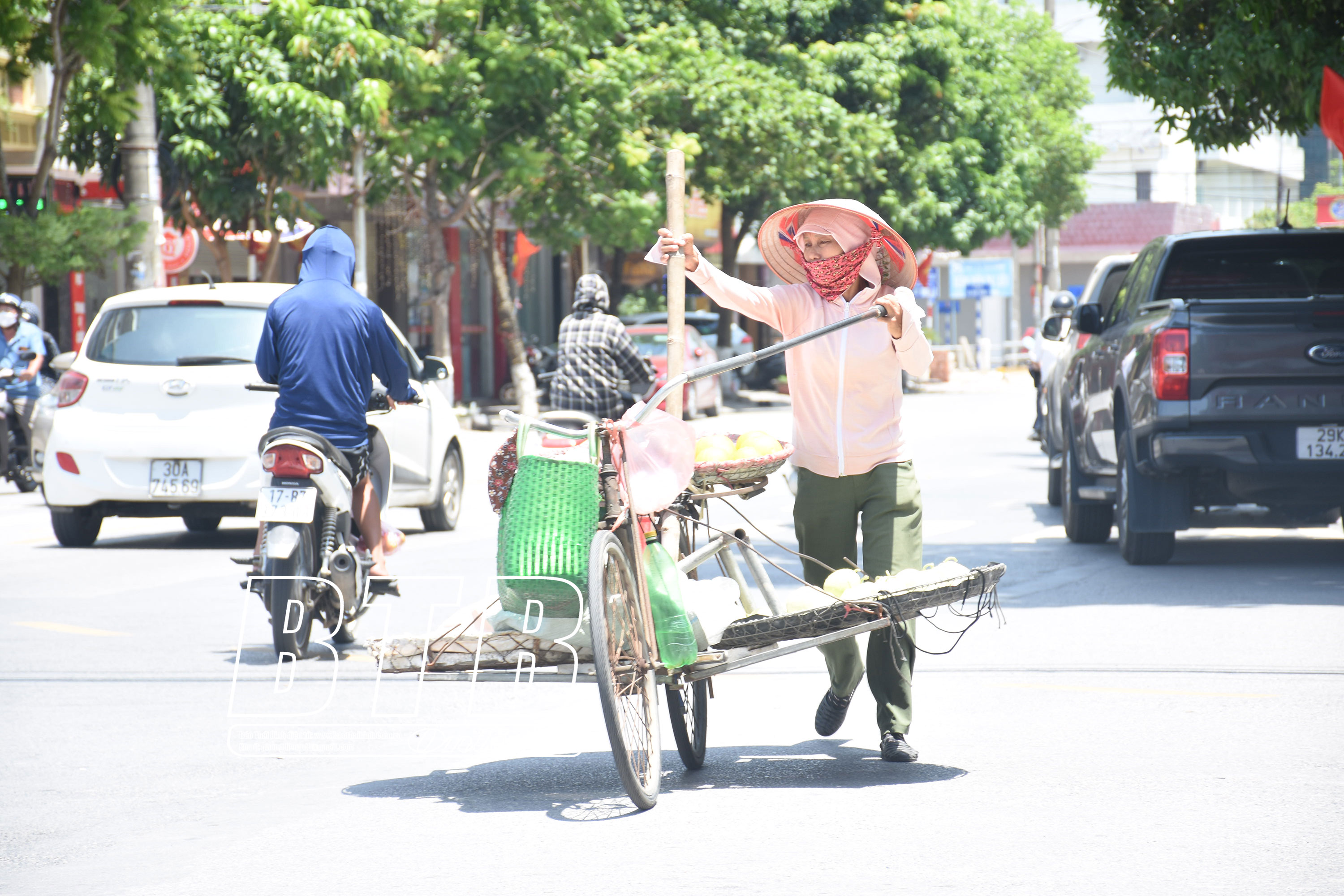 Một người bán hàng rong tại thành phố hoàn thành buổi chợ vào giờ nắng cao điểm, trang phục không thể thiếu là nón lá, khăn trùm đầu, che mặt.