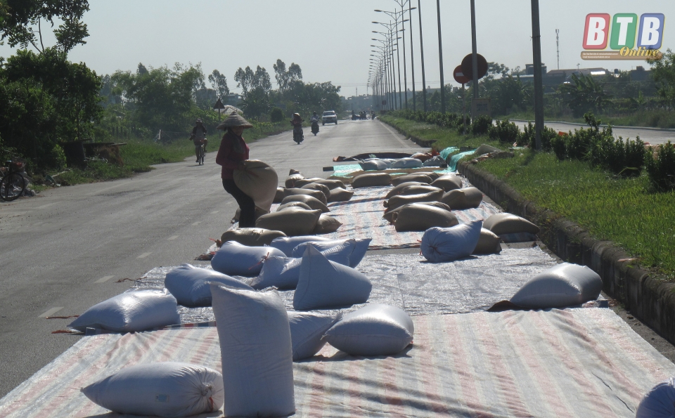 Dọc tuyến đường tránh phía Nam qua địa phận xã Vũ Chính có đến vài chục hộ dân đang phơi thóc.