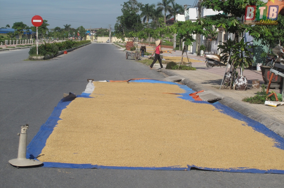 Thóc phơi trên lòng đường tạo thành chướng ngại vật trên mặt đường.