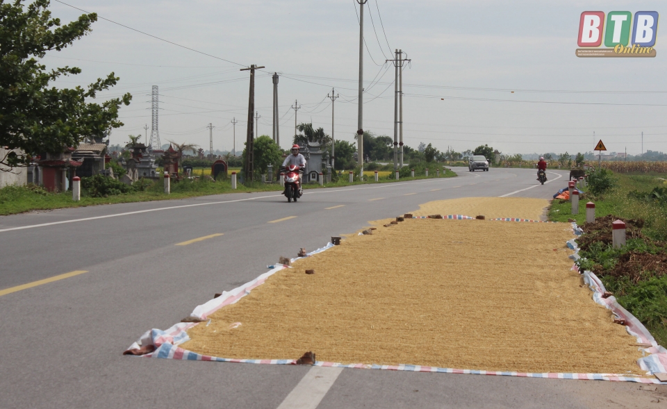 Phơi thóc chiếm ½ lòng đường trên địa bàn xã Thụy Hà.