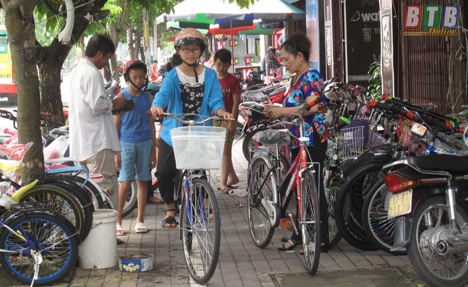Nhiều cửa hàng kinh doanh xe đạp điện trên đường Lý Bôn tận dụng vỉa hè làm nơi kinh doanh.