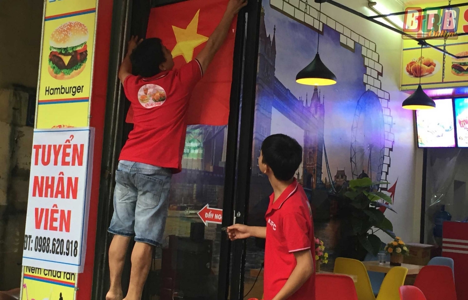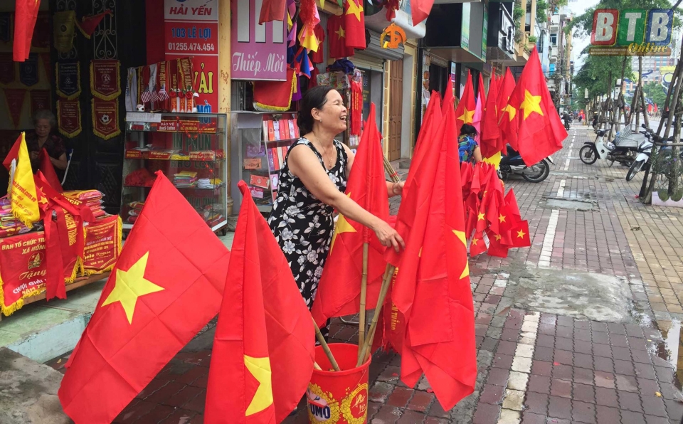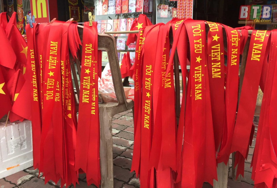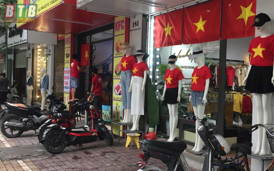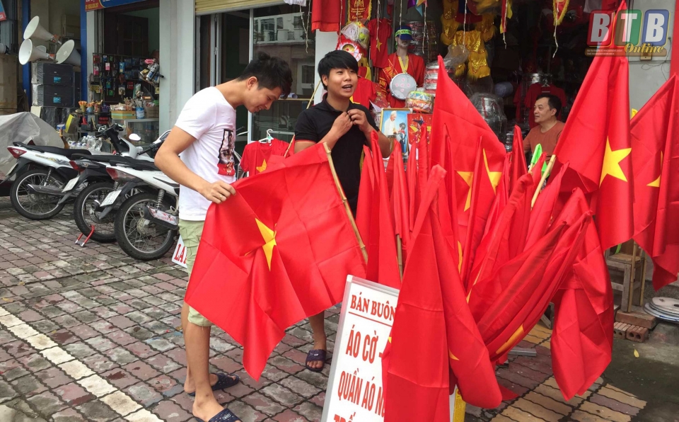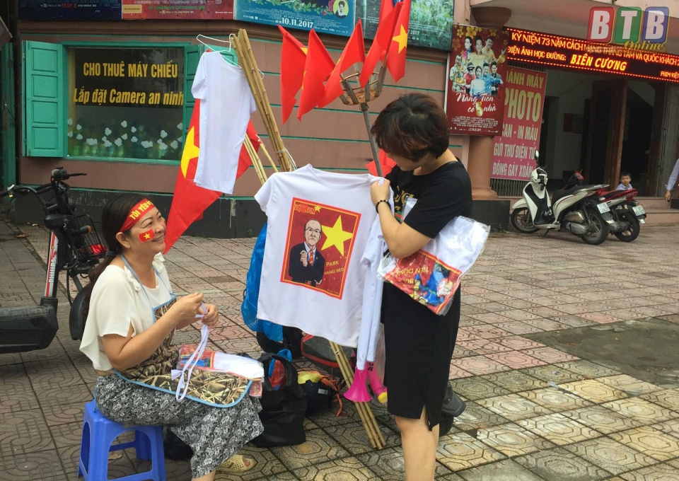 Người hâm mộ mua áo, cờ đỏ sao vàng để cổ vũ đội tuyển.