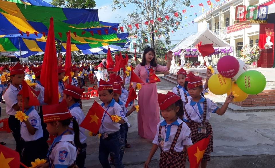 Đón học sinh vào lớp 1 tại Trường Tiểu học và THCS Lê quý Đôn (Hưng Hà). Ảnh: Mai Thư