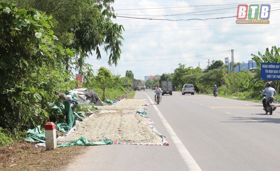 Ngang nhiên phơi hạt nhựa dưới lòng đường 39A đoạn qua địa phận xã Phú Châu.