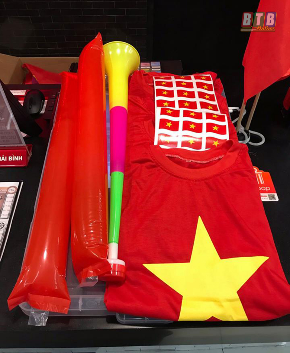 Trung tâm chiếu phim Lotte cinema Thái Bình chuẩn bị áo, kèn, cờ và hình dán cho người đến xem phim trước khi trận chung kết diễn ra.
