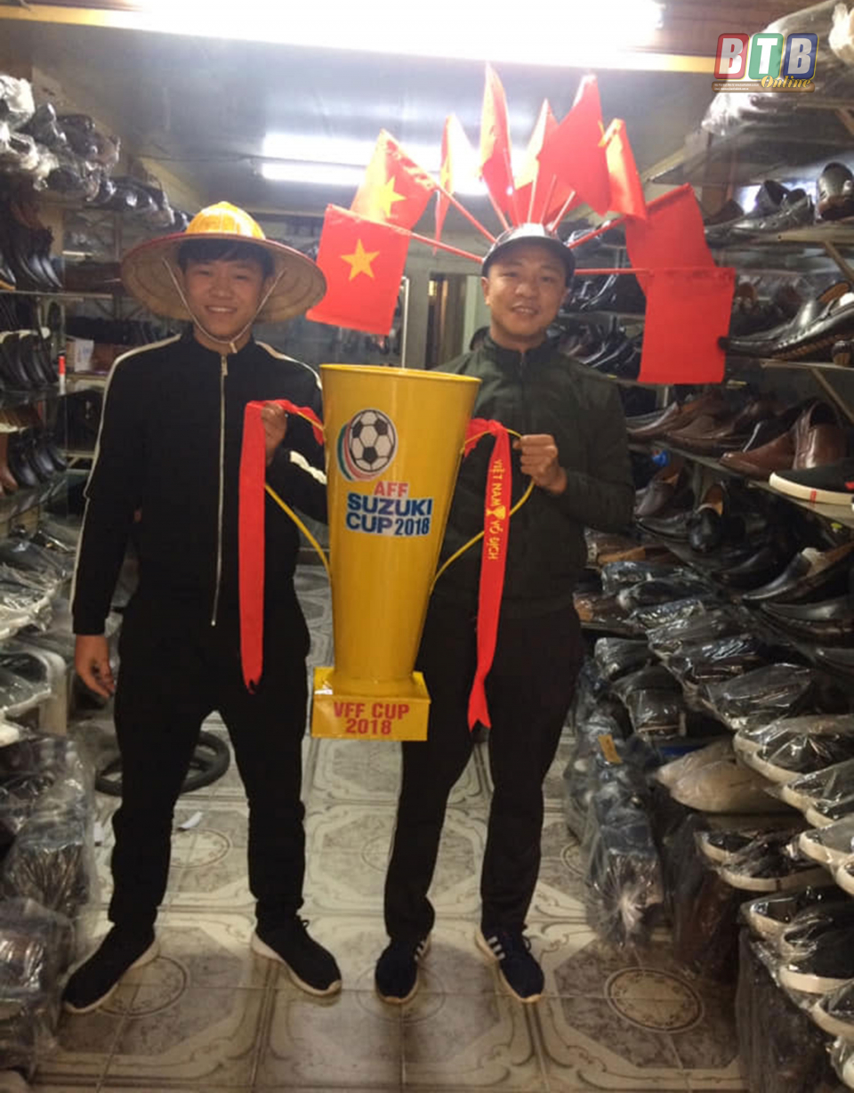Em Nguyễn Viết Kiên và bạn với chiếc cúp vô địch AFF tự làm.