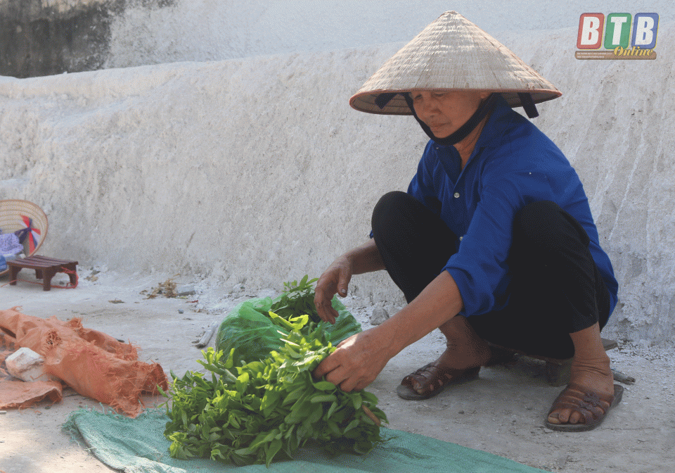 Cô Bùi Thị Tâm, Vũ Đông (thành phố Thái Bình) tận dụng chỗ râm để bày bán mấy mớ rau vườn nhà.