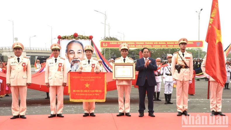 Thủ tướng Phạm Minh Chính trao Danh hiệu Anh hùng Lực lượng vũ trang nhân dân cho Bộ Tư lệnh lực lượng Cảnh sát cơ động. (Ảnh: Trần Hải).