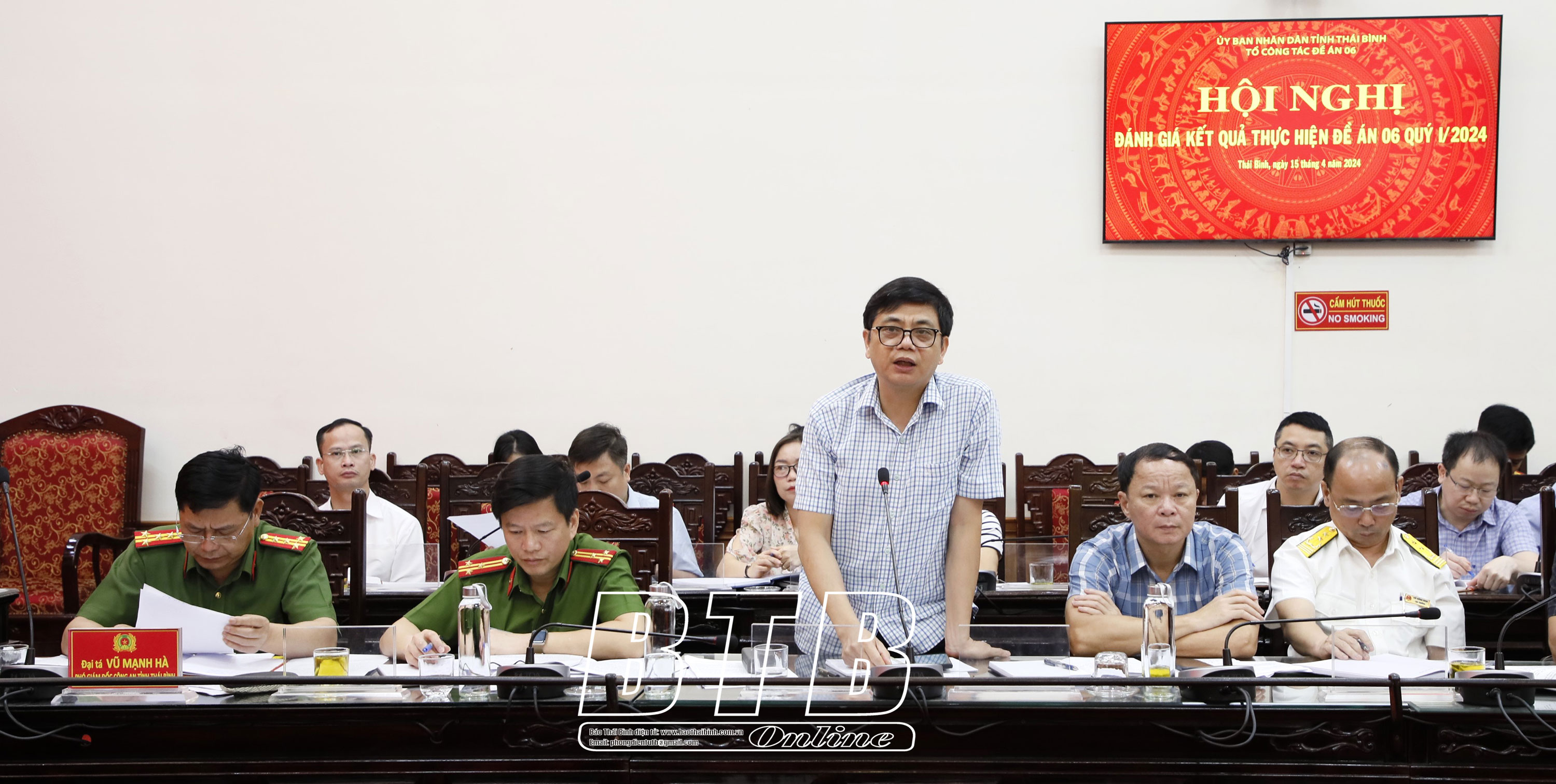 Đại tá Trần Văn Phúc, Ủy viên Ban Thường vụ Tỉnh ủy, Giám đốc Công an tỉnh, Tổ phó Tổ công tác Đề án 06 của tỉnh phát biểu tại hội nghị.