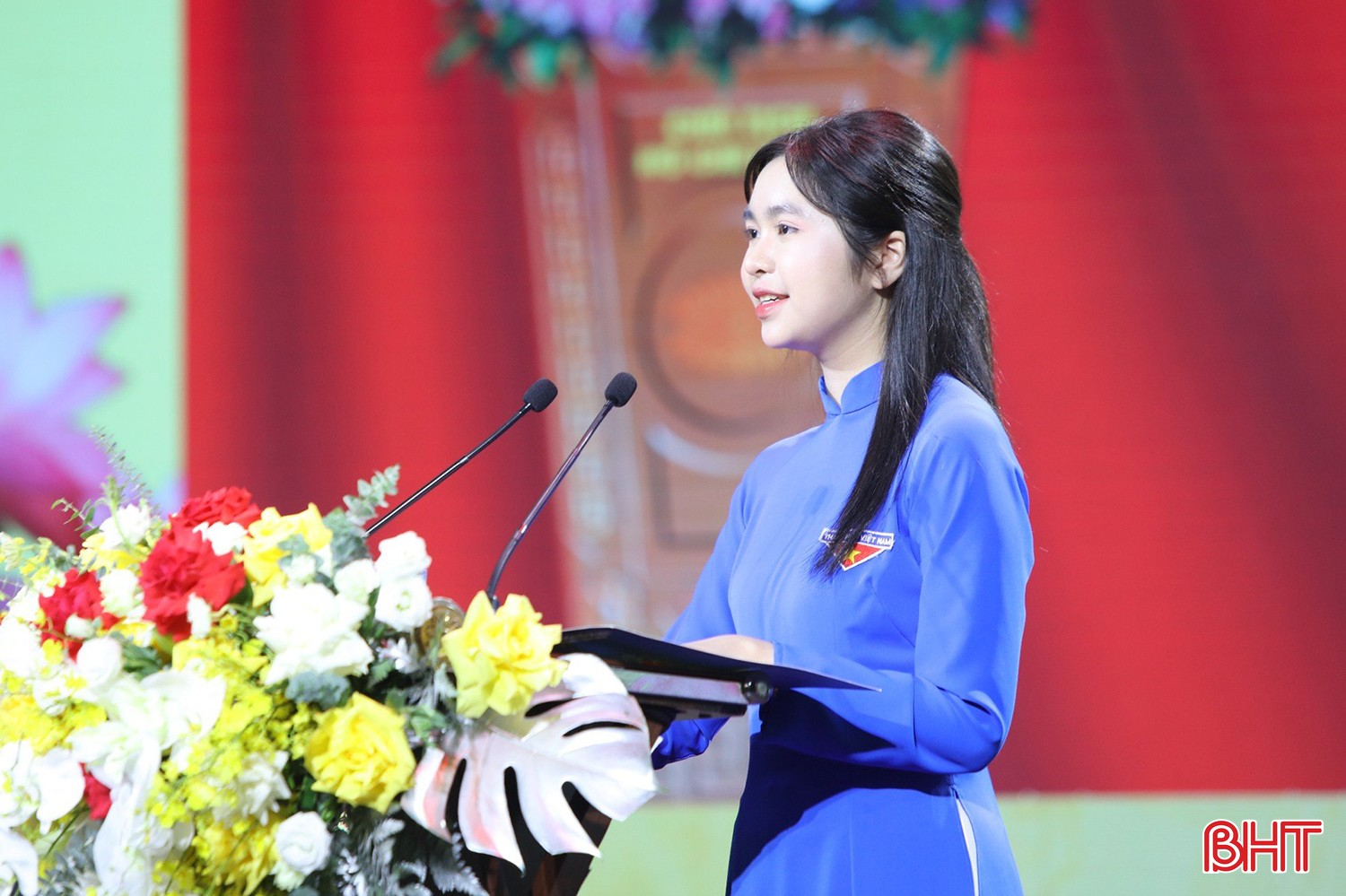 Em Hồ Phương Linh - Chi đoàn lớp 10 Anh1, Trường THPT Chuyên Hà Tĩnh đại diện thế hệ trẻ tỉnh nhà phát biểu tại buổi lễ.